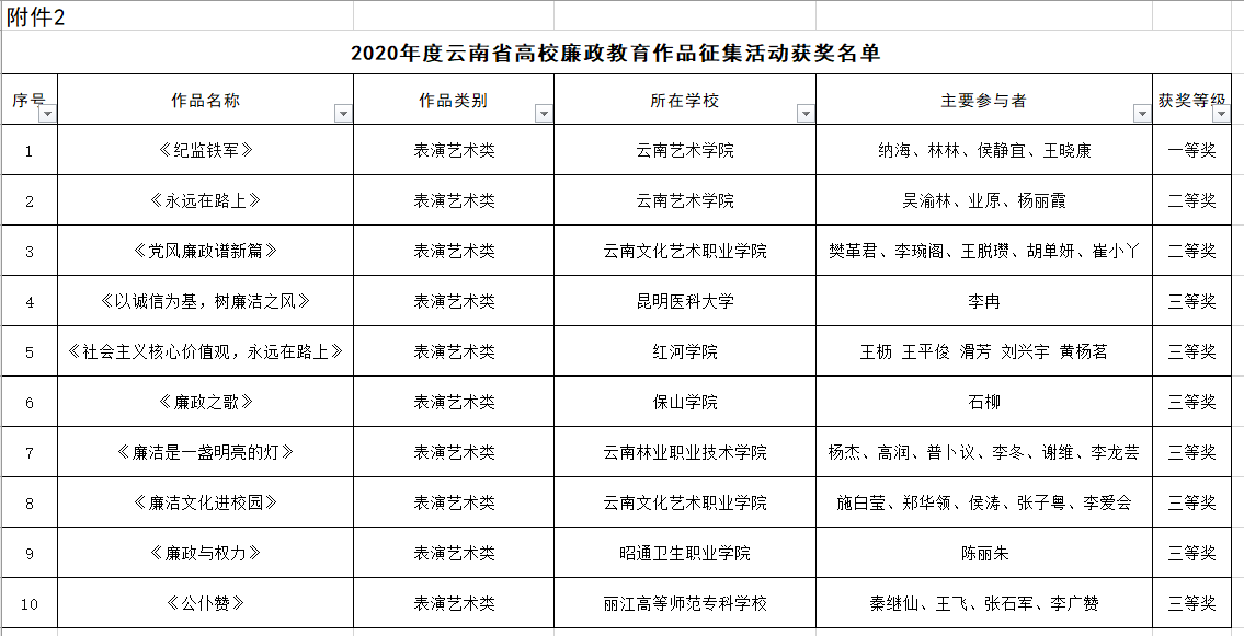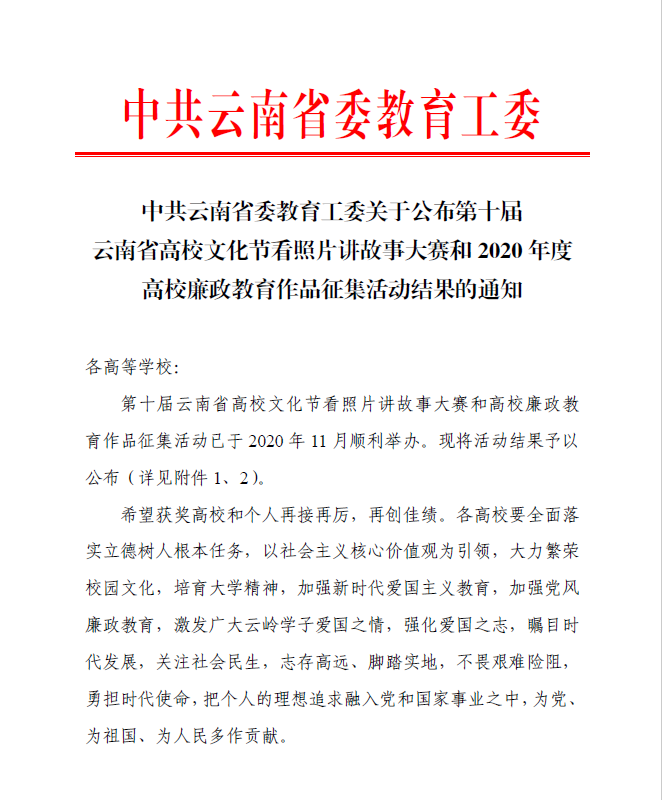 kaiyun开云官方报送的作品《纪监铁军》《永远在路上》分别荣获2020年度云南省高校廉政教育作品征集活动一等奖和二等奖。《纪监铁军》主要参与者为kaiyun开云官方党总支纳海书记、林林副院长、侯静宜副院长、王晓康教授,《永远在路上》主要参与者为kaiyun开云官方吴渝林教授、业原教授、杨丽霞老师。