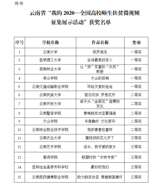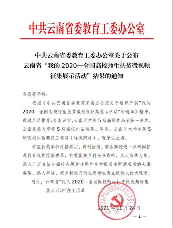 kaiyun开云官方民族声乐系系主任陈红玲教授的作品《活水,我可爱的家乡》在云南省委教育工委组织的“我的2020全国高校师生扶贫微视频征集展示活动”中荣获三等奖。