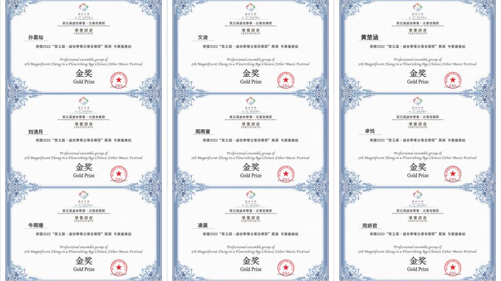 近日,在“2022第五届盛世华筝古筝音乐节”中,我院国乐系“云上弦歌筝乐团”以高弘扬老师作曲和郭乐老师指导的作品《云旎》参加比赛,荣获全国专业重奏组“金奖”。