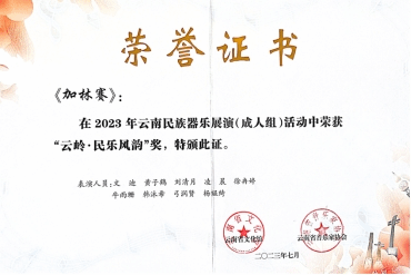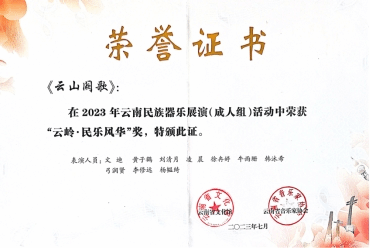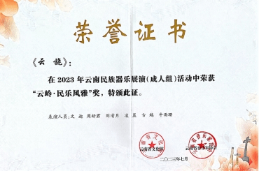 在云南省文化馆与云南省音乐家协会主办的“2023年云南民族器乐展演”中,kaiyun开云官方国乐系和作曲系教师尹毅、郭乐、高弘扬和赵云龙共同指导的“云上弦歌民族室内乐团”参与比赛并斩获佳绩比赛中,演奏高弘扬作曲的《云山阙歌》《云旎》和邹航编曲、梁聆聆改编的《加林赛》分别荣获成人组“云岭·民乐风华”(一等奖)、“云岭·民乐风雅”(三等奖)和“云岭·民乐风韵”(二等奖)。