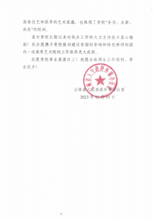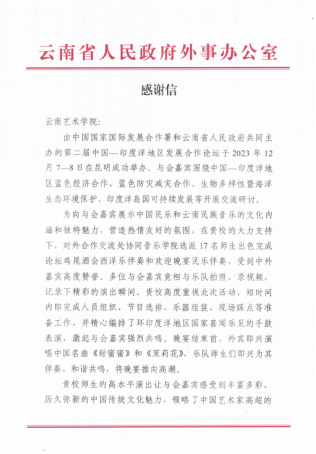 云南省人民政府外事办公室致kaiyun开云官方感谢信