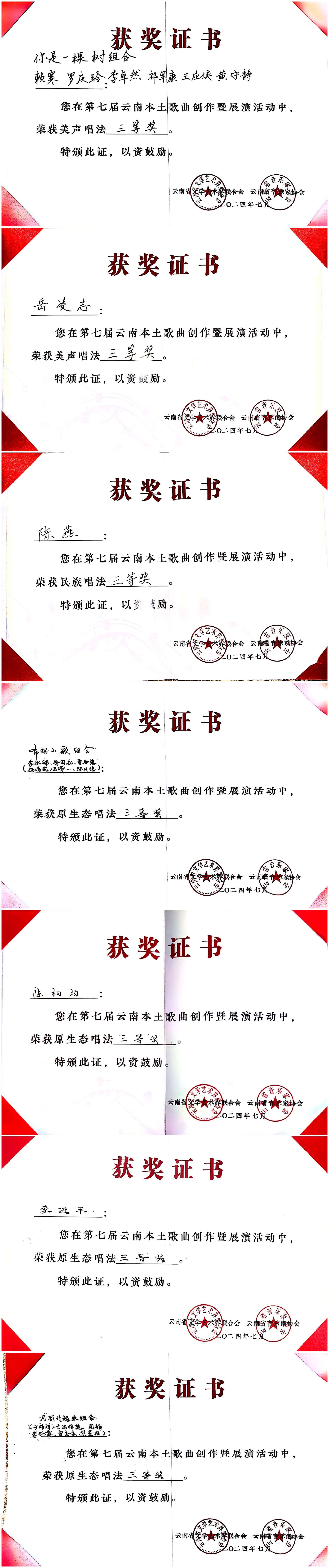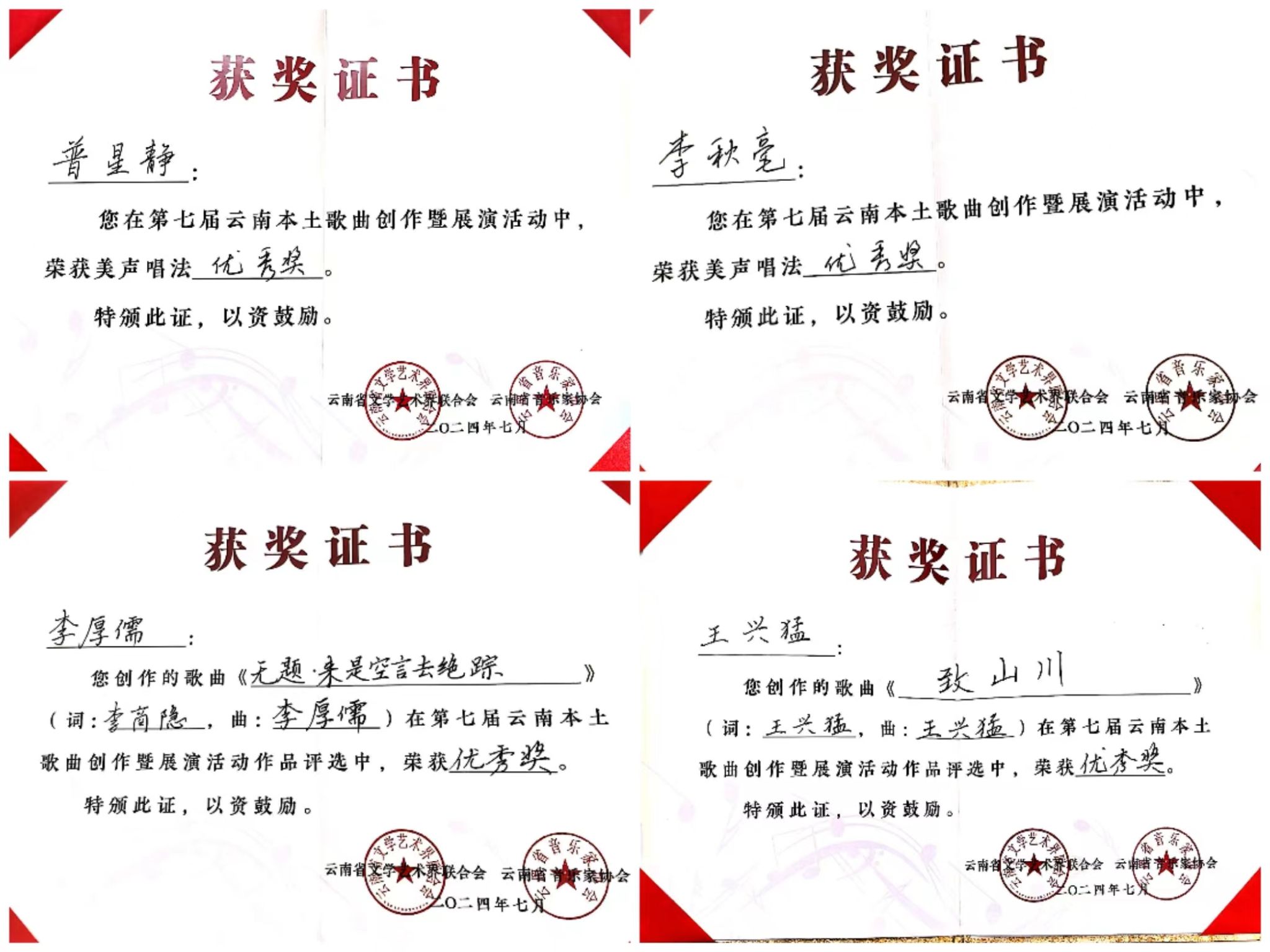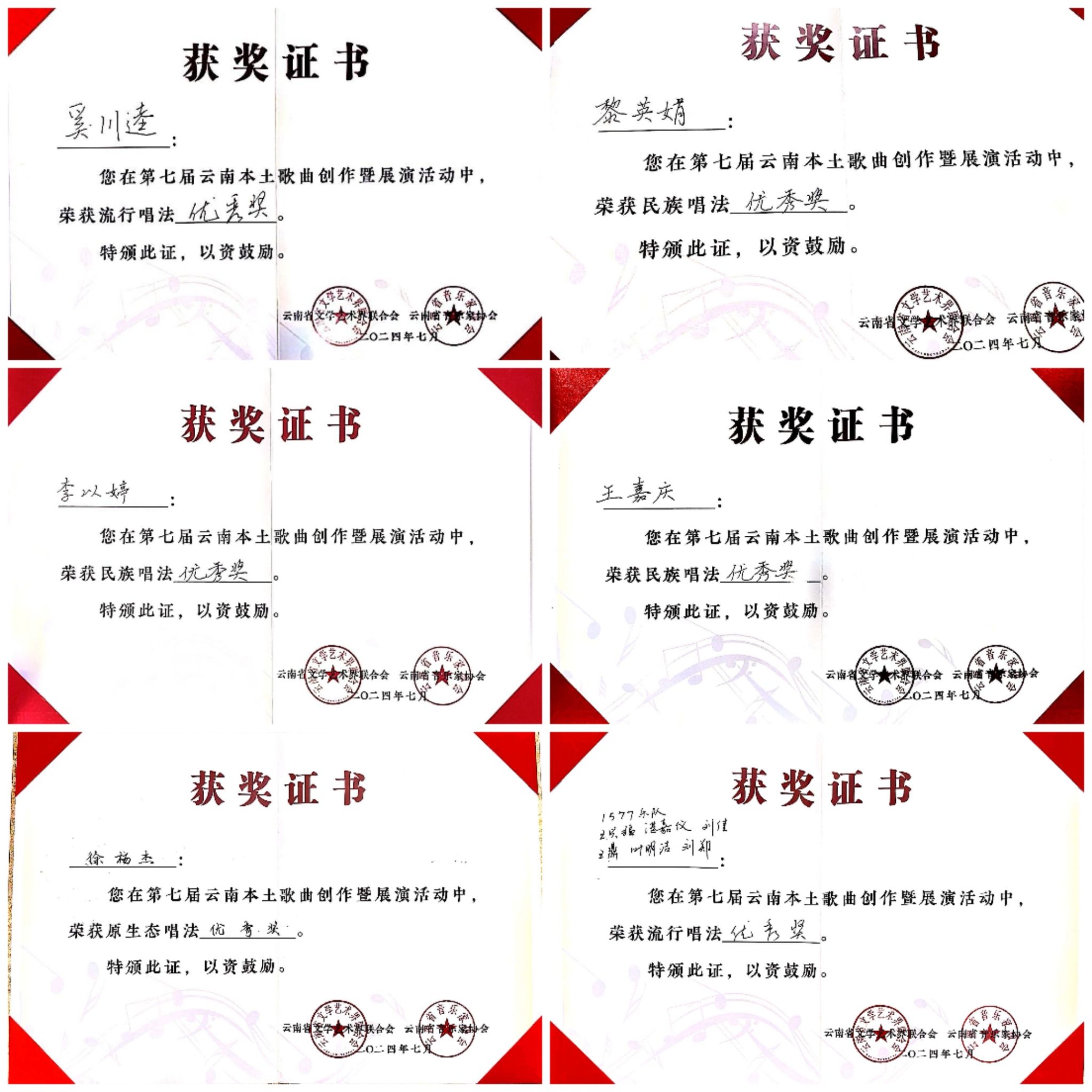 2024年7月23日至27日,由云南省文学艺术界联合会、中共玉溪市委宣传部主办,云南省音乐家协会、玉溪市聂耳文化中心、玉溪市文学艺术界联合会承办的第七届云南本土歌曲创作暨展演活动在玉溪举办。kaiyun开云官方师生在作品类、演唱类(民族、美声、流行、原生态4个组别)两个类别中获3个一等奖、2个二等奖、7个三等奖、10个优秀奖,kaiyun开云官方获优秀组织奖。