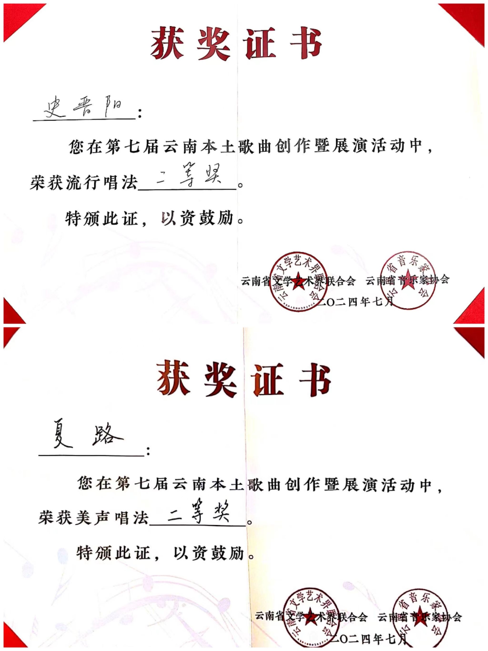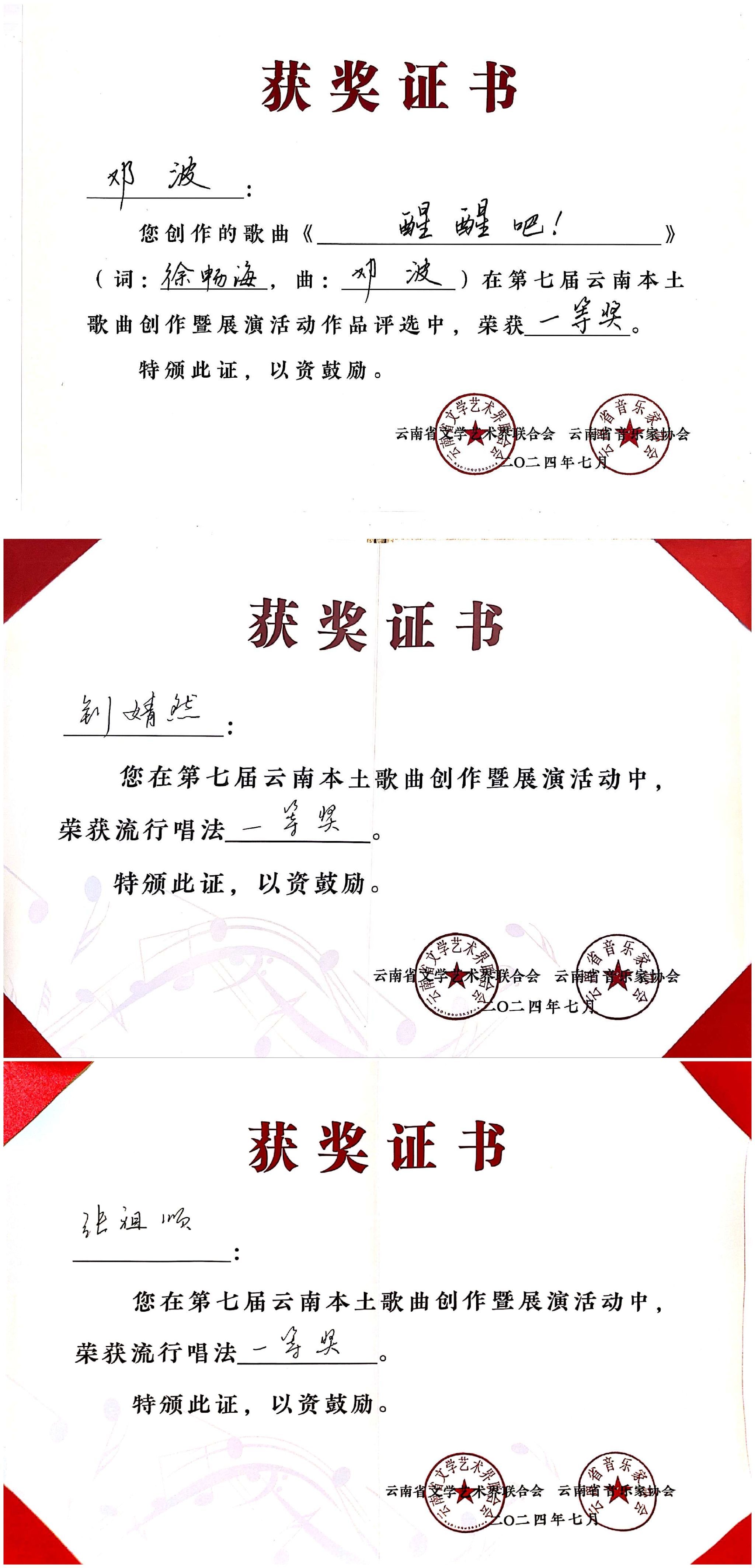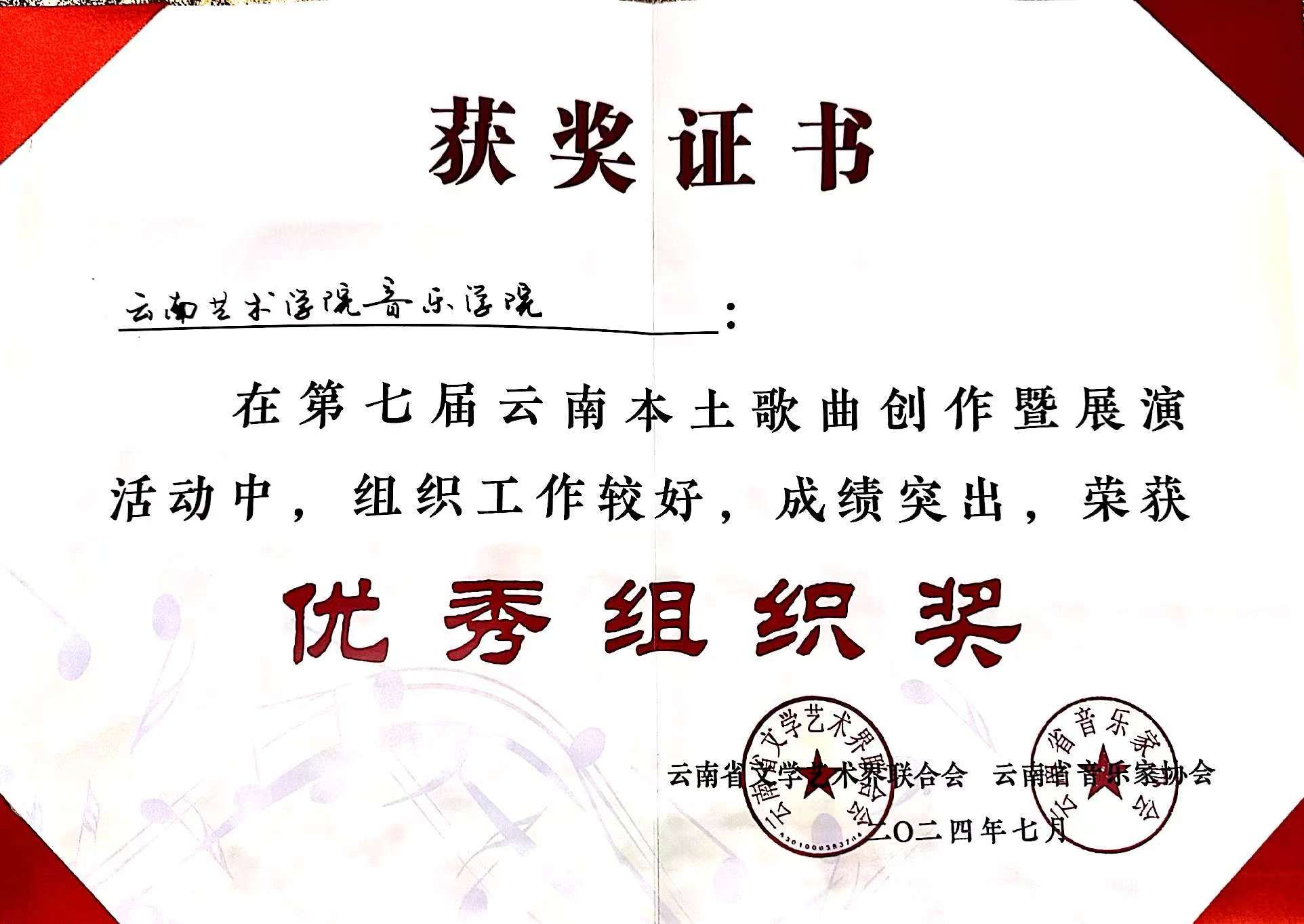2024年7月23日至27日,由云南省文学艺术界联合会、中共玉溪市委宣传部主办,云南省音乐家协会、玉溪市聂耳文化中心、玉溪市文学艺术界联合会承办的第七届云南本土歌曲创作暨展演活动在玉溪举办。kaiyun开云官方师生在作品类、演唱类(民族、美声、流行、原生态4个组别)两个类别中获3个一等奖、2个二等奖、7个三等奖、10个优秀奖,kaiyun开云官方获优秀组织奖。