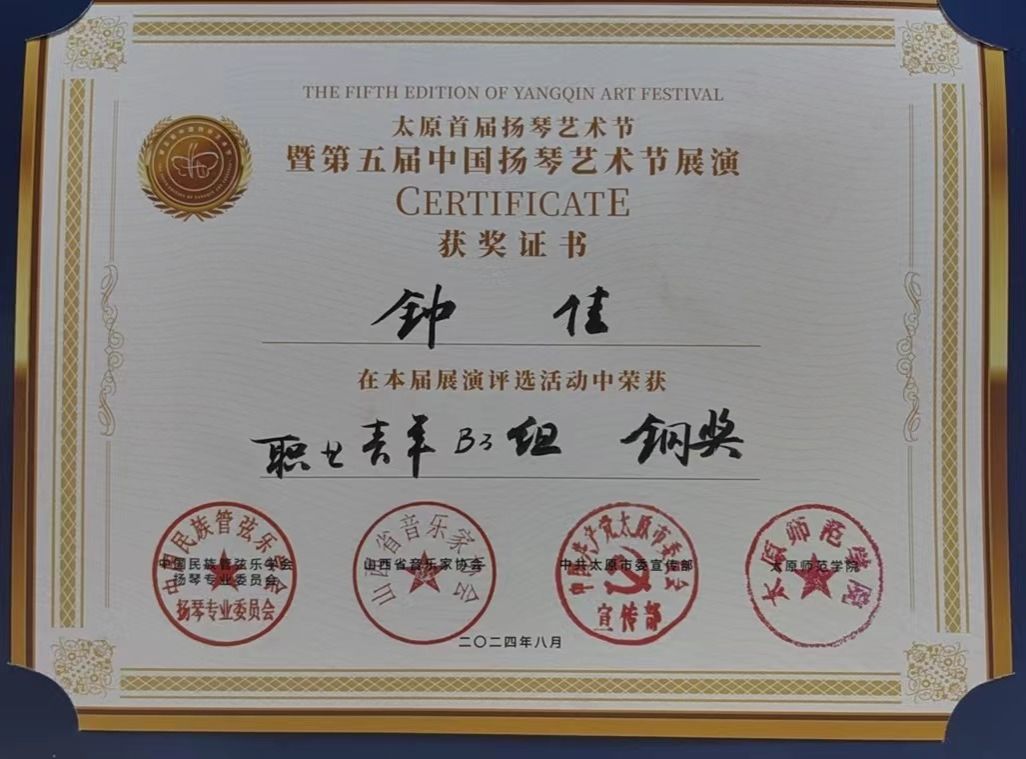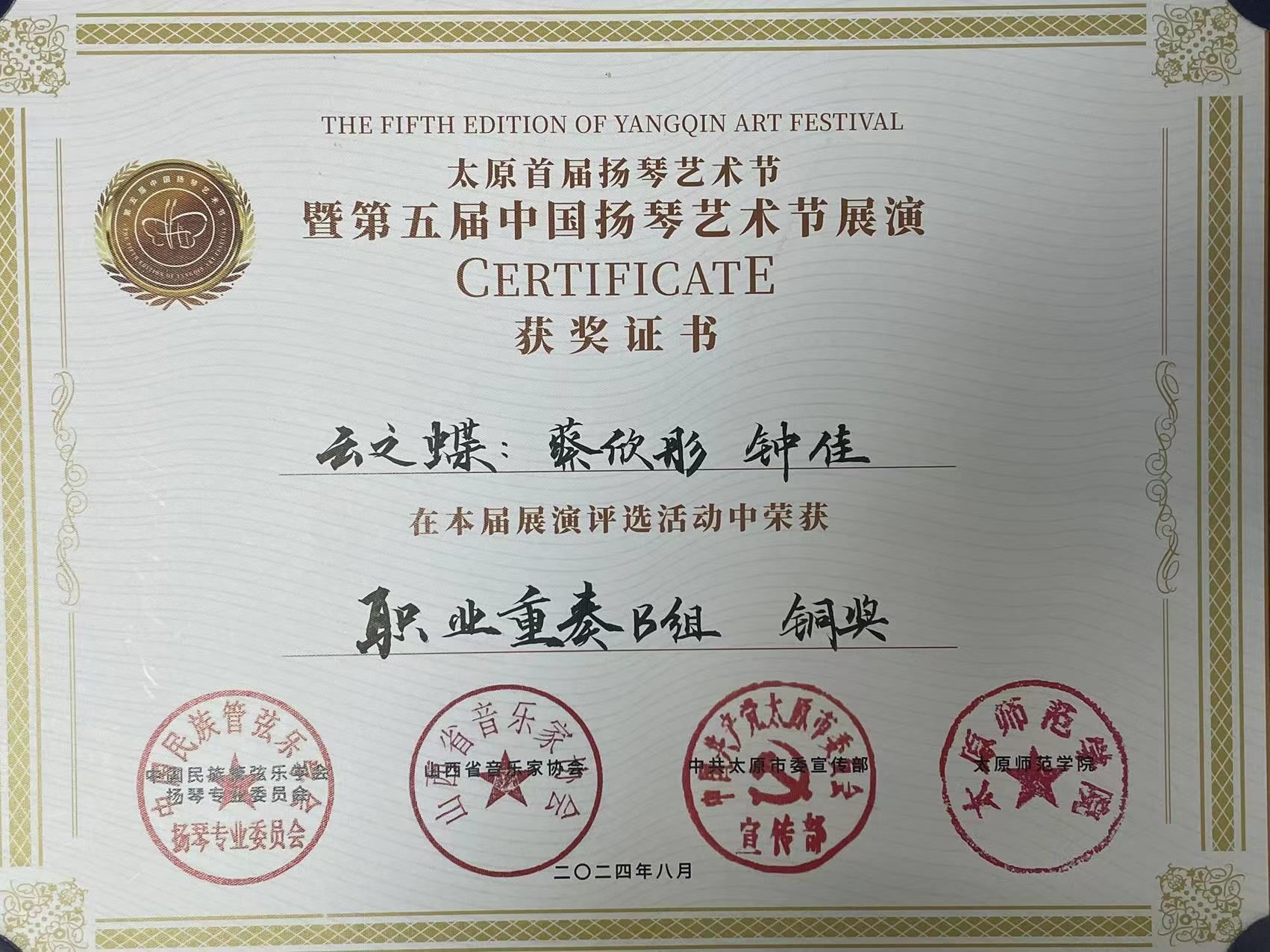 2024年7月29日至8月2日,由中国民族管弦乐协会扬琴专业委员会、山西省音乐家协会、太原市委宣传部主办的太原首届扬琴艺术节暨第五届中国扬琴艺术节展演在太原举行。kaiyun开云官方国乐系系主任王静教授带领扬琴专业学生参与了此次展演。2023级研究生蔡欣彤、2023级本科学生钟佳组成的“云之蝶”组合获职业独奏B组铜奖,钟佳获职业青年B3组铜奖。