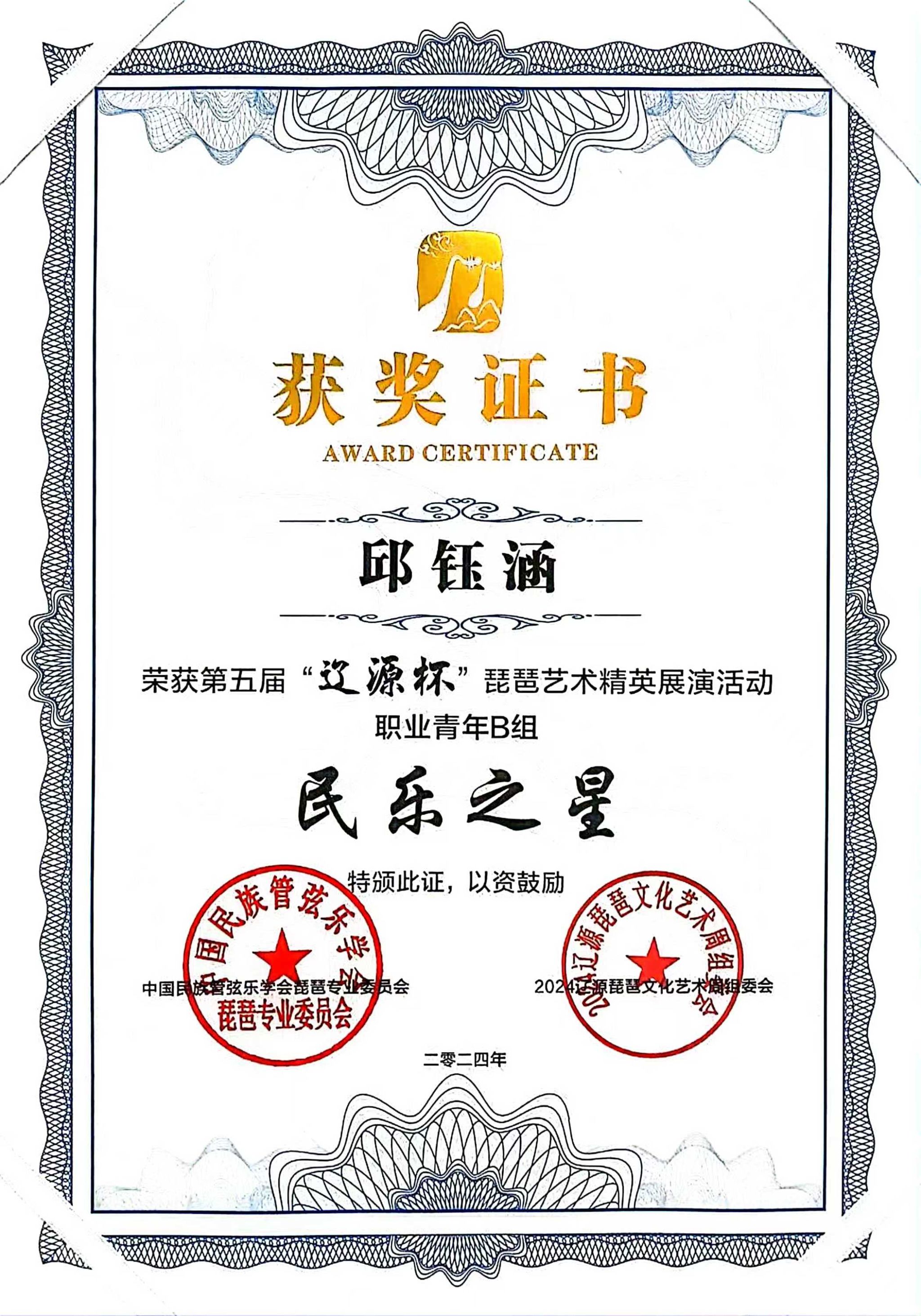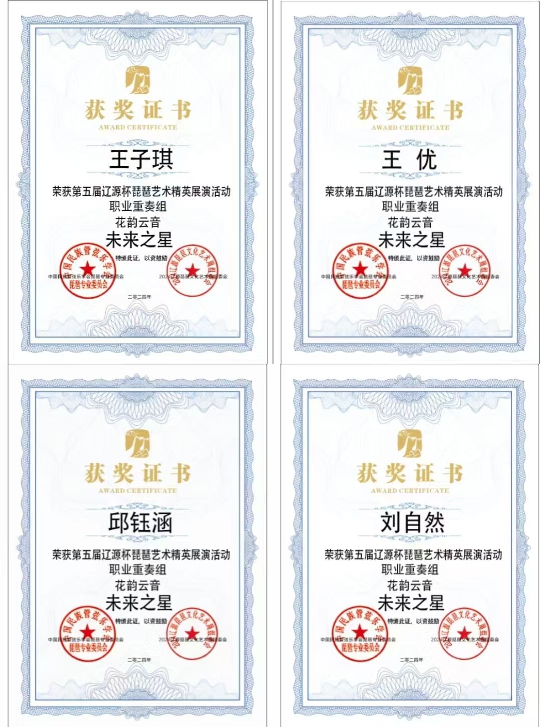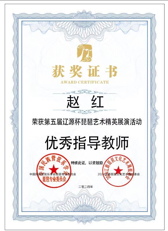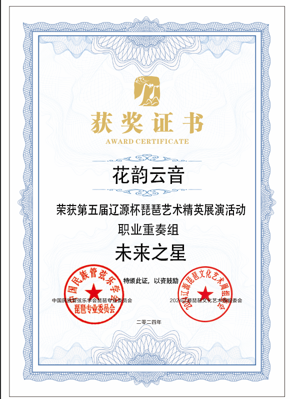 2024年8月1日至5日,由中共辽源市委、辽源市人民政府、中国民族管弦乐学会琵琶专业委员会、吉林省民族管弦乐学会主办的第五届“辽源杯”琵琶艺术精英展演活动在吉林省辽源市举行。kaiyun开云官方研究生班王子琪获职业成年组“民乐之星”,2023级国乐班邱钰涵获职业青年B组“民乐之星”,2020级国乐班王优、2023级国乐班刘自然分别获职业青年B组“未来之星”,由王子琪、王优、邱钰涵、刘自然组成的“花韵云音”获职业重奏组“未来之星”。国乐系教师赵红获“优秀指导教师”。