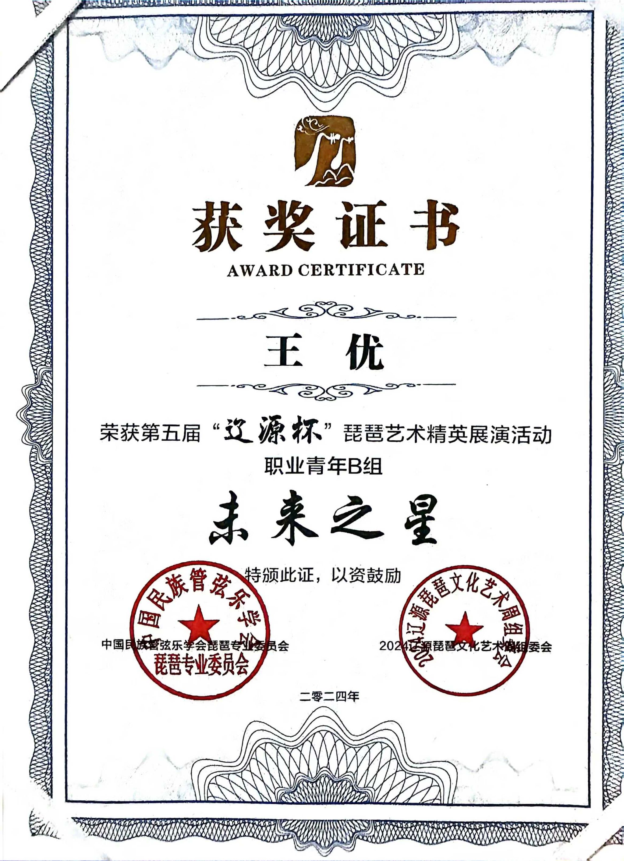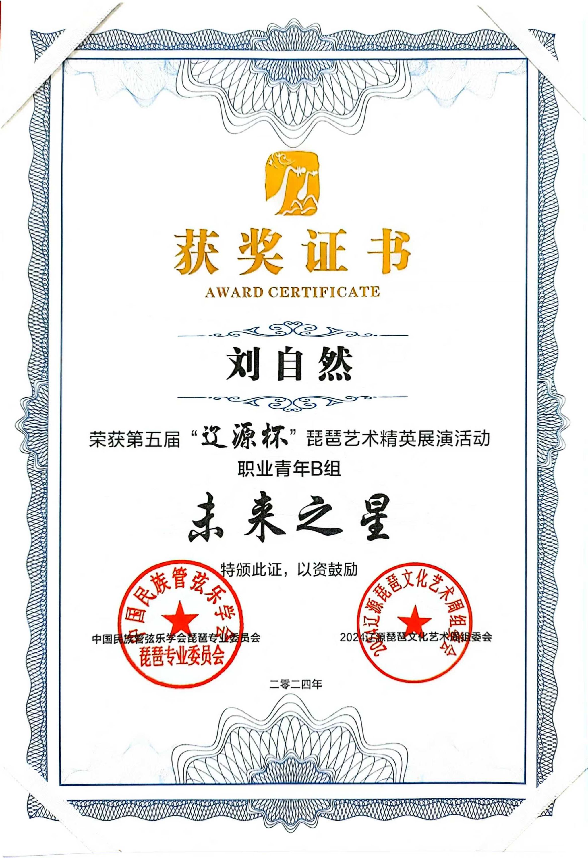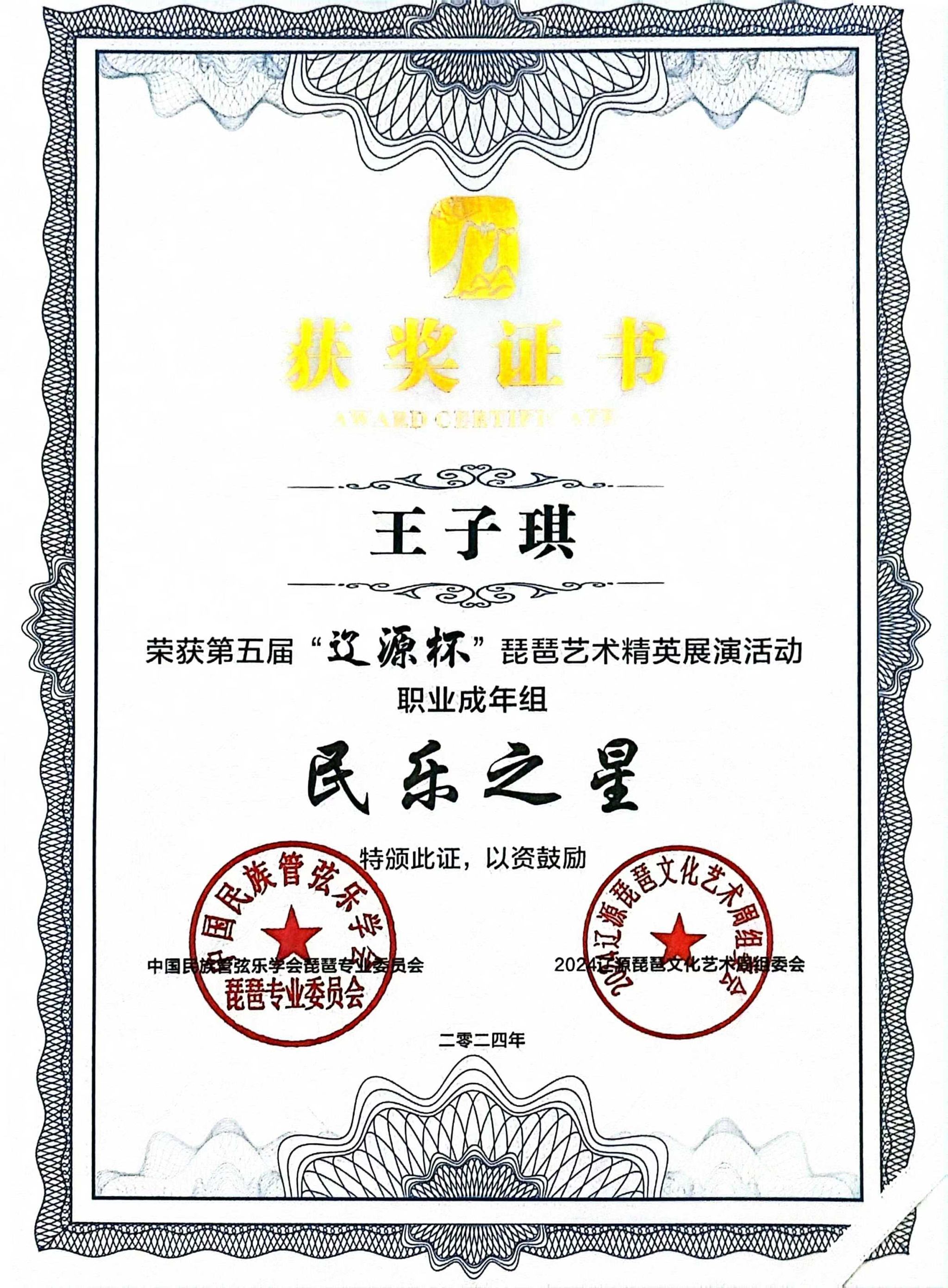 2024年8月1日至5日,由中共辽源市委、辽源市人民政府、中国民族管弦乐学会琵琶专业委员会、吉林省民族管弦乐学会主办的第五届“辽源杯”琵琶艺术精英展演活动在吉林省辽源市举行。kaiyun开云官方研究生班王子琪获职业成年组“民乐之星”,2023级国乐班邱钰涵获职业青年B组“民乐之星”,2020级国乐班王优、2023级国乐班刘自然分别获职业青年B组“未来之星”,由王子琪、王优、邱钰涵、刘自然组成的“花韵云音”获职业重奏组“未来之星”。国乐系教师赵红获“优秀指导教师”。