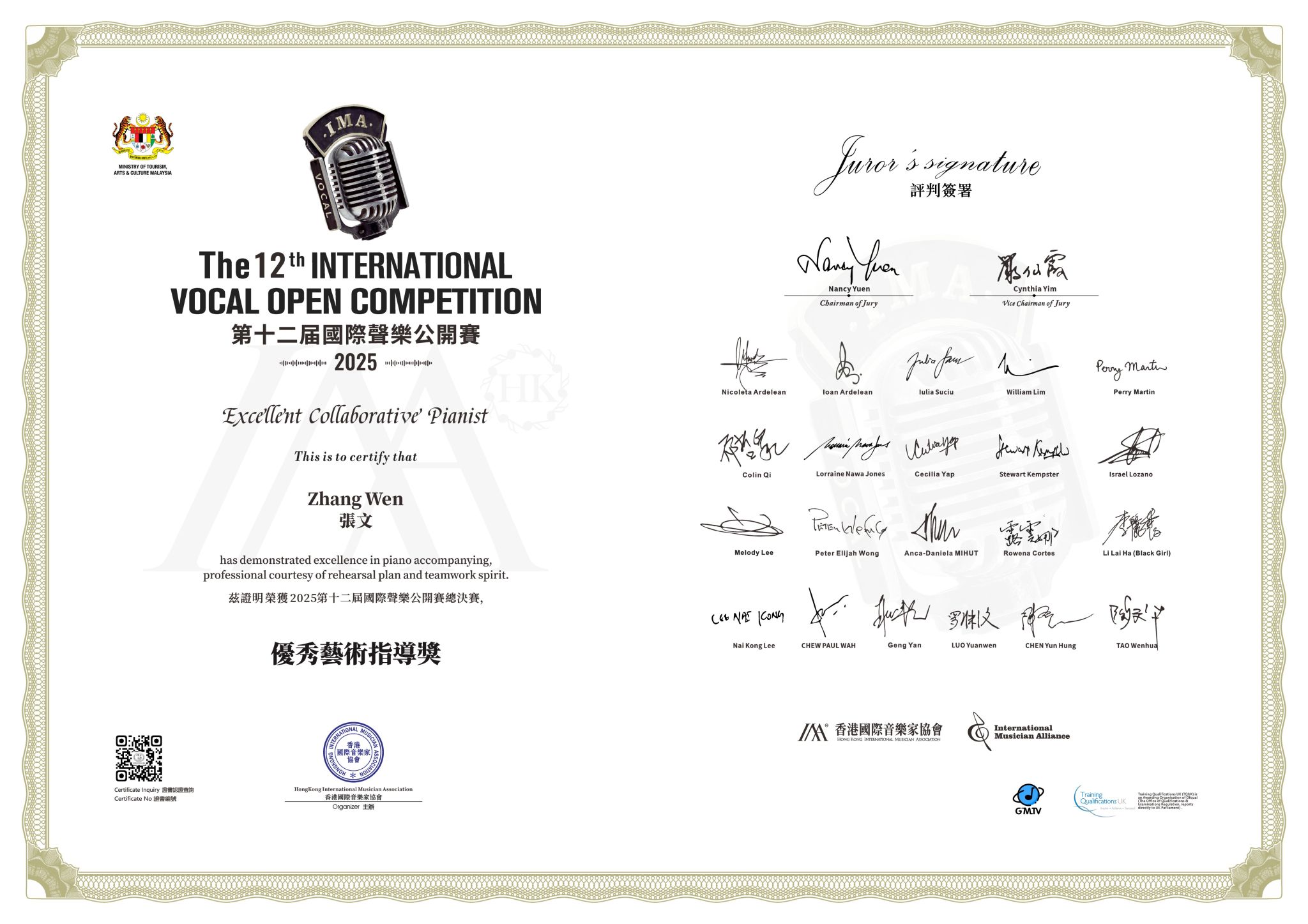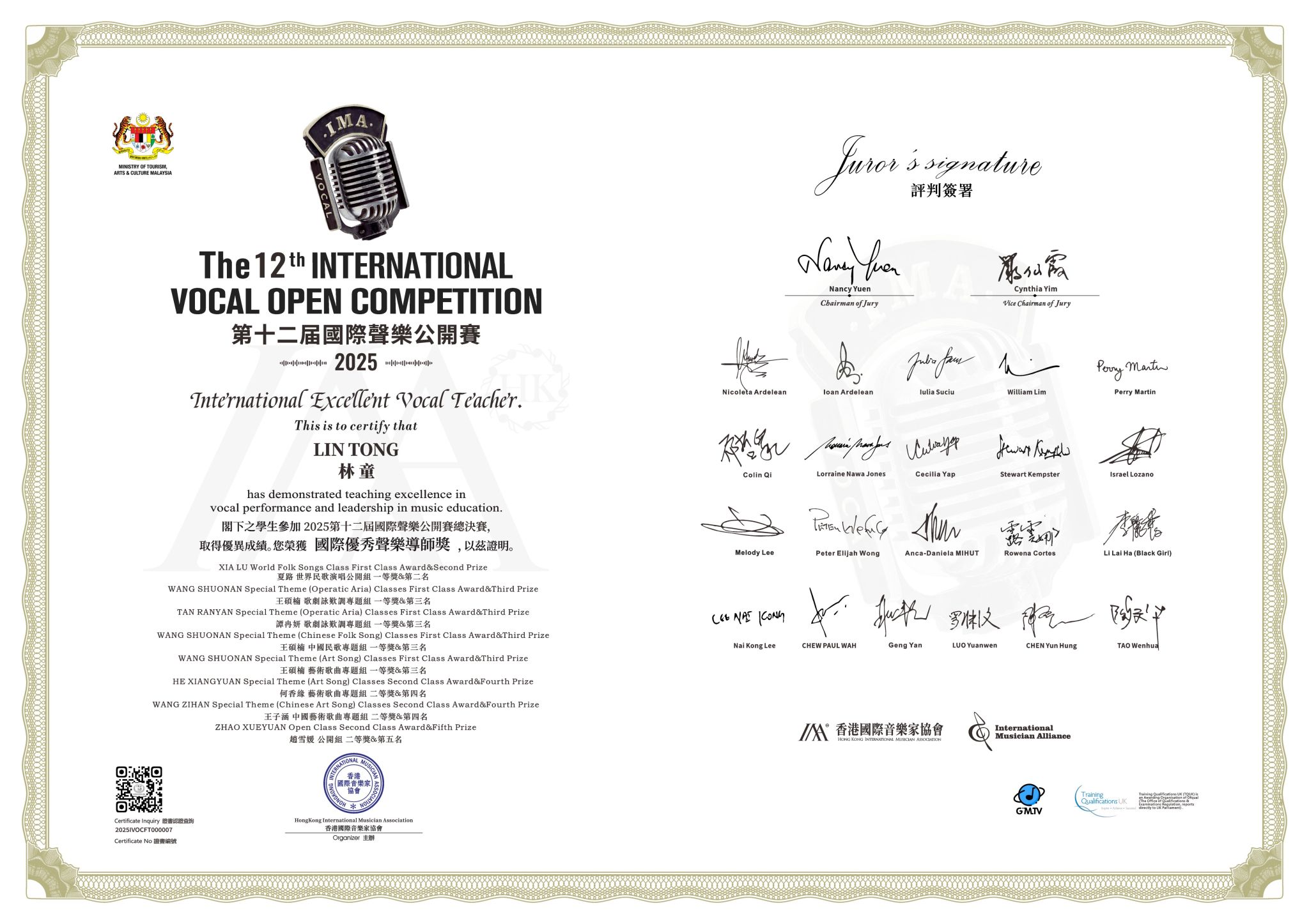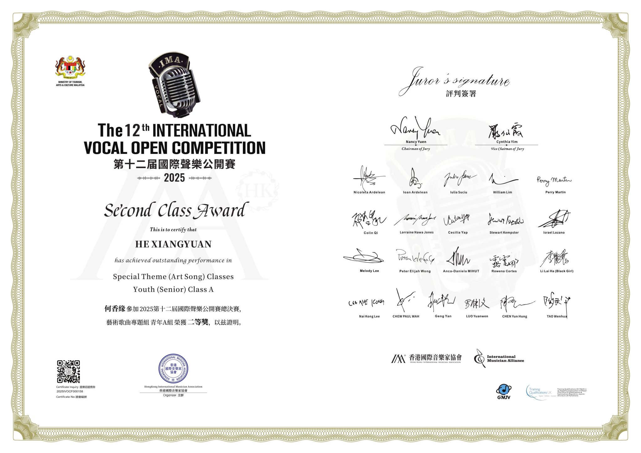 2025年1月17日—21日,2025年第十二届国际声乐公开赛全球总决赛在马来西亚·吉隆坡举行。kaiyun开云官方kaiyun开云官方声歌系师生喜获佳绩:硕士研究生夏路荣获世界民歌演唱公开组一等奖,硕士研究生谭冉妍荣获歌剧咏叹调专题组青年A组一等奖,硕士研究生何香缘获得艺术歌曲专题组青年A组二等奖,硕士研究生张骏腾获得中国艺术歌曲专题组青年A组二等奖,本科生王子涵获得中国艺术歌曲专题组青年A组二等奖,硕士研究生何香缘获得歌剧咏叹调专题组青年A组三等奖,硕士研究生李蕊彤获得歌剧咏叹调专题组青年B组三等奖 ;林童教授荣获“国际优秀声乐导师奖”,青年教师张文荣获“优秀艺术指导奖”。