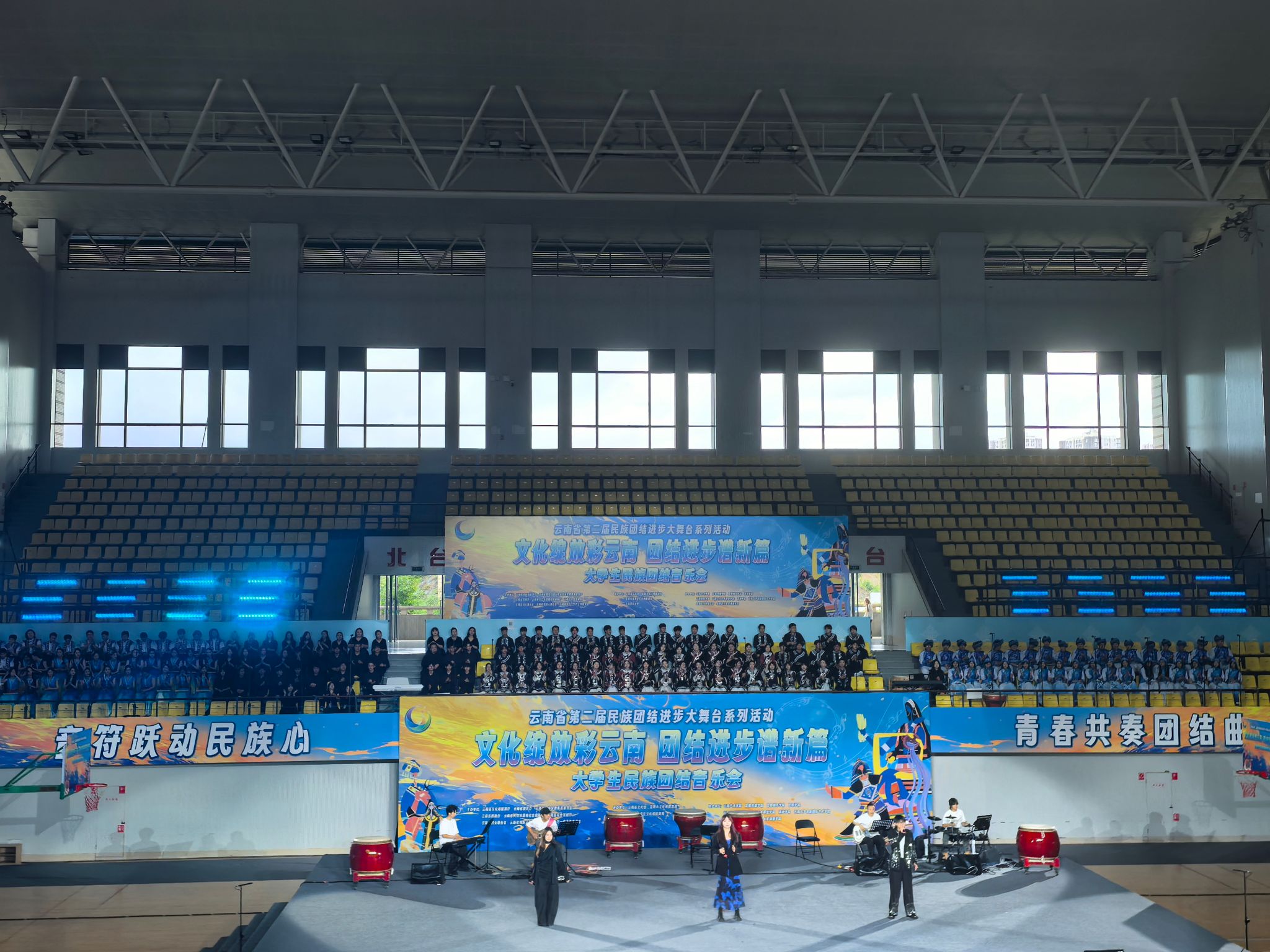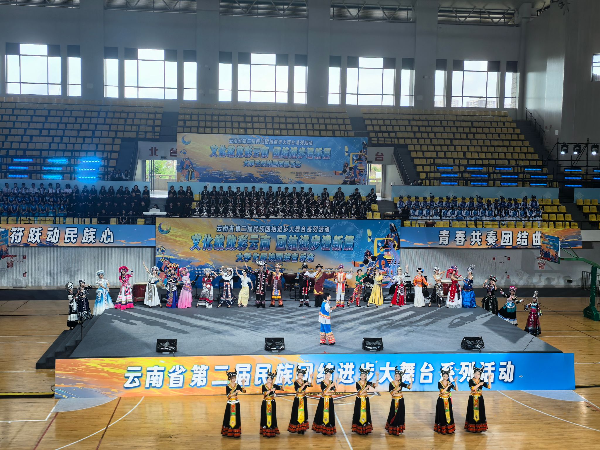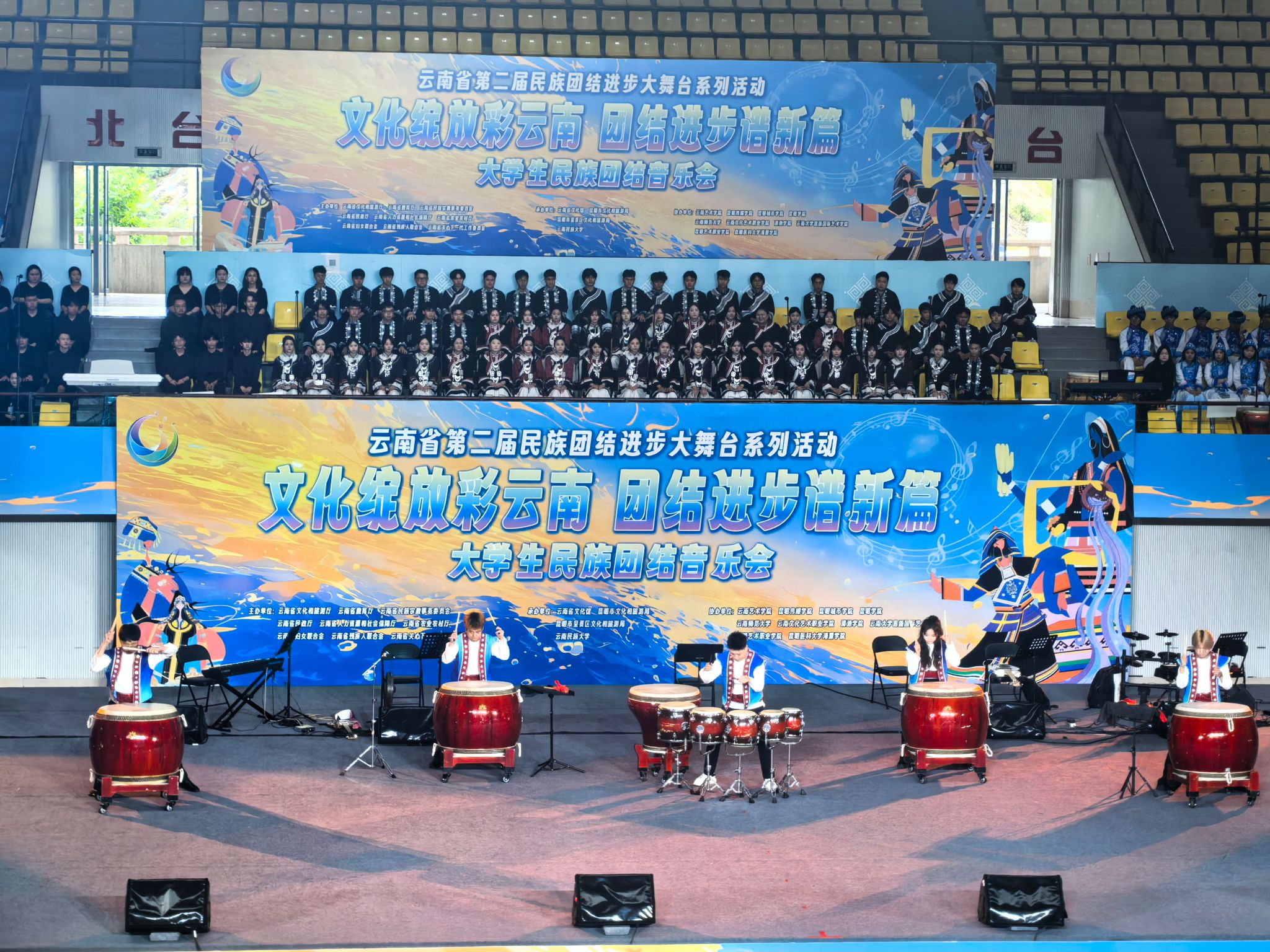 2025年6月15日,由云南省文化和旅游厅、省教育厅等多家单位联合主办的云南省第二届民族团结进步大舞台系列活动——“文化绽放彩云南 团结进步谱新篇”大学生民族团结音乐会在云南民族大学精彩上演,来自全省11所高校的300余名师生同台献艺。kaiyun开云官方kaiyun开云官方选送《滇鼓-乐之魂》《排角姑娘》《山寨猎歌》《怒放的生命》4个节目参与演出。党委委员、副院长郎启训出席音乐会,kaiyun开云官方师生代表到现场观看音乐会。