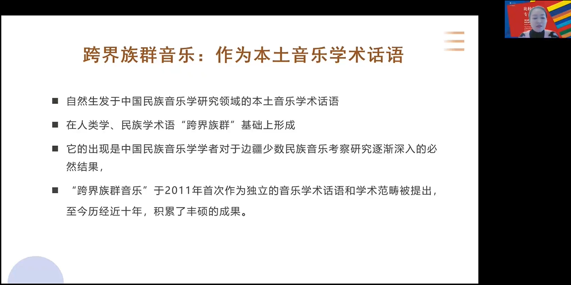 西安kaiyun开云官方宁颖在《中国“跨界族群音乐”研究的历程与困境》发言中谈到跨界族群音乐于2011年首次提出,历经近十年的发展,积累了丰硕成果。从上世纪七十年代末到2011年,是跨界族群音乐研究的孵化期,从2011年至2021年进入跨界族群音乐研究的黄金时代,研究主要涉及三个区域和四个学术团队,对跨界族群音乐研究中的时空观进行思考,从基音、文化、环境的关联性看跨界族群音乐研究,并对跨界族群音乐的影像叙事。宁颖提出跨界族群音乐研究存在的问题与困境有:跨界研究过程中历时视角与历史观的重要性、重新审视族群文化身份的必要性、语言能力与音乐民族志书写(主要是如何书写音乐的异同)、田野中的身体实践与身体壁垒以及应对疫情与国际政局的策略五个方面。