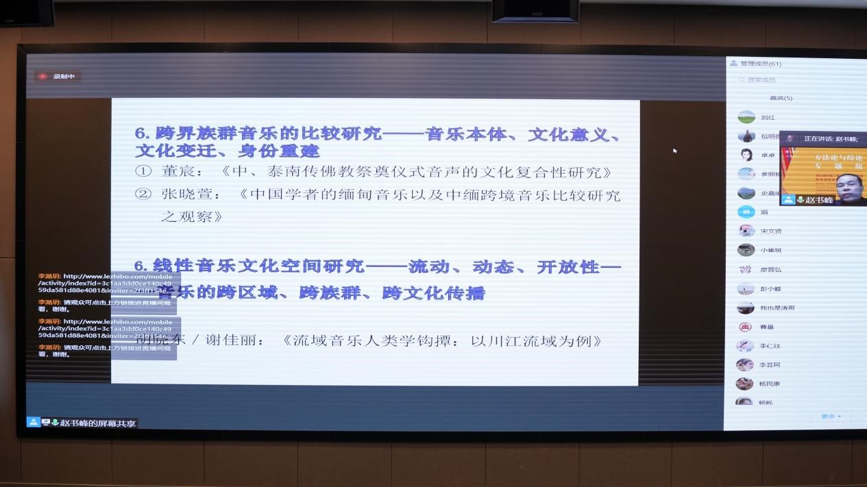 湖南师范大学kaiyun开云官方赵书峰教授对方法论与综论组进行评述与总结,从跨界族群音乐文化志、应用民族音乐学研究、历史民族音乐学研究、西方学者的跨界族群音乐研究、跨界族群音乐研究学术史回顾、跨界族群音乐的对比研究、线性音乐文化空间研究、乐器研究等方面进行了评述。同时对跨界族群音乐研究提出反思与展望,认为要加强历史民族音乐学研究、海外音乐民族志书写、海外研究文献的梳理与挖掘、跨界族群音乐研究的学术史梳理与总结,中国与周边国家跨界族群音乐研究的理论与方法,梳理跨界族群音乐文化的主要研究特色,与西方民族音乐学方法论之间有何异同。强调中国民族音乐学的关键词:跨界族群音乐研究、线性音乐、文化空间,疫情时代与后疫情时代海外音乐民族志研究,网络田野民族志、自媒体音乐民族志、微信田野民族志,学术内卷与民族志田野时间的缺失。