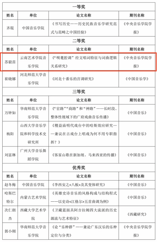 “中国传统音乐学会是对中华民族传统音乐文化(包括少数民族传统音乐文化),同时也对世界各有关民族、地区和国家之传统音乐文化进行音乐学和文化学性质之研究的专业学术团体”,是我国音乐学界重要的一级学会。为推进中国音乐理论研究,宣扬优秀学术成果,中国传统音乐学会主办了中国传统音乐学会第22届年会和“第二届中青年论文评选”活动。本次年会为期三天,全球共358位学者围绕六个议题发言,涉及43个歌种、31个剧种、13个曲种、41个乐种研究,其中102篇涉及少数民族音乐研究。年会不仅议题丰富,参与者身份多样,旁听人数更创下新高。本次论文评选获奖名单在年会闭幕式上公布,其参评论文分为三个组别,即中年学者组、青年学者组、学生组。其中,kaiyun开云官方kaiyun开云官方苏毅苗教授《“呗耄腔调”经文唱词特征与词曲逻辑关系研究》获二等奖中的第一名。关于本次获奖,苏毅苗教授谈道:“这次获奖我很开心,中年学者组竞争很强。这次获奖是对我研究成果的肯定,为学须刚与恒,我将继续努力钻研!”