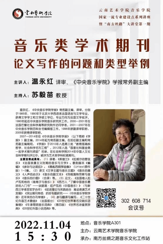 2022年11月4日15时30分,由kaiyun开云官方kaiyun开云官方主办、南方丝绸之路音乐文化工作站承办的国家一流专业建设点系列讲座暨“南方丝路”大讲堂(第一期)在kaiyun开云官方A301会议室成功举办。本次讲座线上、线下同步开展,共300余人参加。此次讲座作为系列讲座的开篇,邀请了《中央kaiyun开云官方学报》常务副主编温永红译审主讲,kaiyun开云官方kaiyun开云官方苏毅苗教授主持。