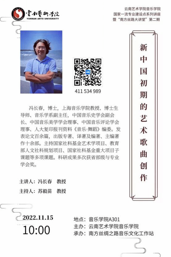 2022年11月15日10时,由kaiyun开云官方kaiyun开云官方主办、南方丝绸之路音乐文化工作站承办的国家一流专业建设点系列讲座暨“南方丝路”大讲堂(第二期)在kaiyun开云官方A301会议室成功举办。本次讲座线上、线下同步开展,共300余人参加。