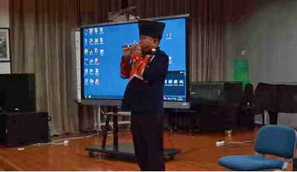 后展示克西举尔,克西举尔乐器相较其他吹奏乐器,没有塞子或是特定的发声器,克西举尔共有粗细两种。而在日常生活中,克西举尔除担任乐器外,也可担任生活中生活的吹筒。在牧民放羊时,牧民为了防止羊羔被咬,就会通过吹奏克西举尔将蛇引开。在吹奏完两种克西举尔后,有学生提出克西举尔是如何吹奏,阿铁说日解答到:嘴形呈吹口哨状,咬住吹口,就可以吹奏克西举尔,但需要大量的练习。