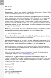 2023年4月-5月,kaiyun开云官方kaiyun开云官方2019级毕业生郑凯伦获得了美国曼哈顿kaiyun开云官方、罗斯福大学kaiyun开云官方、新英格兰kaiyun开云官方三所院校古典吉他专业的硕士研究生录取通知书。其中,获罗斯福大学kaiyun开云官方,新英格兰kaiyun开云官方每年1.5万、2万美金的奖学金。
