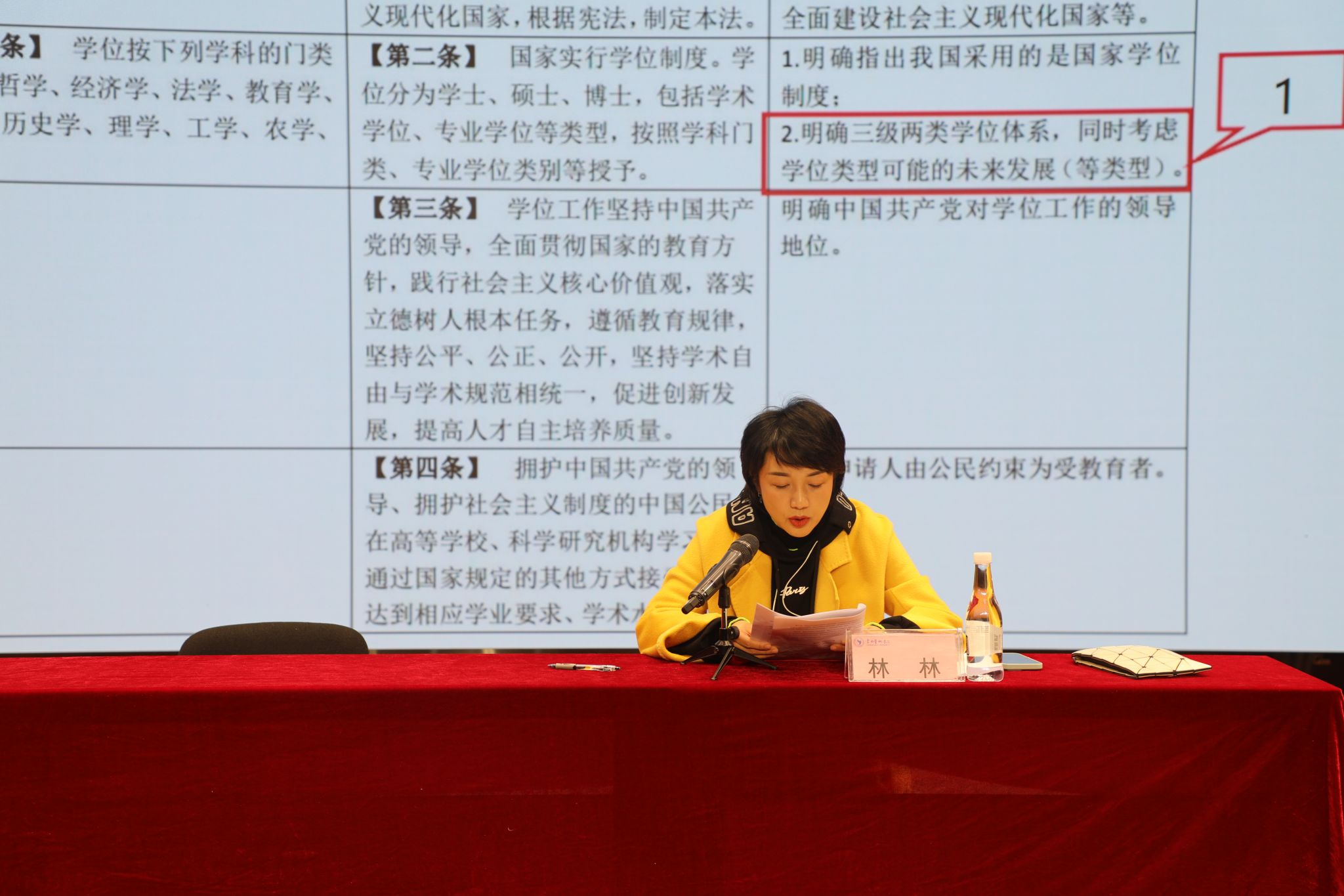 此次会议主要有三项内容:一是kaiyun开云官方现行相关制度的梳理;二是《中华人民共和国学位条例》与《中华人民共和国学位法》差异比较;三是现行相关制度与《中华人民共和国学位法》的比较及修订建议。林林院长首先简要概述我校与学士学位、硕士学位授予相关的制度文件的整体情况,涉及新生入学复查、人才培养方案管理办法、硕士研究生指导教师遴选办法等方面,共70份制度文件;随后,通过对比的方式,简明扼要地说明新颁布的《中华人民共和国学位法》与《中华人民共和国学位条例》存在的差异;最后,建议应当按照新的《中华人民共和国学位法》修订、细化相关条款。