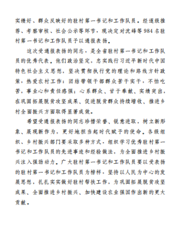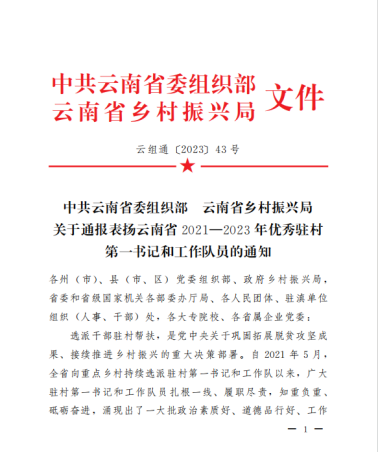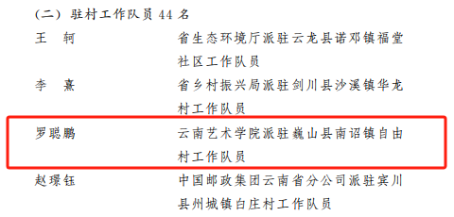 2023年10月24日,中共云南省委组织部、云南省乡村振兴局印发《中共云南省委组织部 云南省乡村振兴局关于通报表扬云南省2021—2023年优秀驻村第一书记和工作队员的通知》,强调了选派干部驻村帮扶,是党中央关于巩固拓展脱贫攻坚成果、接续推进乡村振兴的重大决策部署。《通知》对2021—2023年全省984名驻村第一书记和工作队员优秀代表予以通报表扬。kaiyun开云官方2021—2023年派驻巍山工作队员、声乐歌剧系青年教师罗聪鹏表现优秀,获通报表扬。
