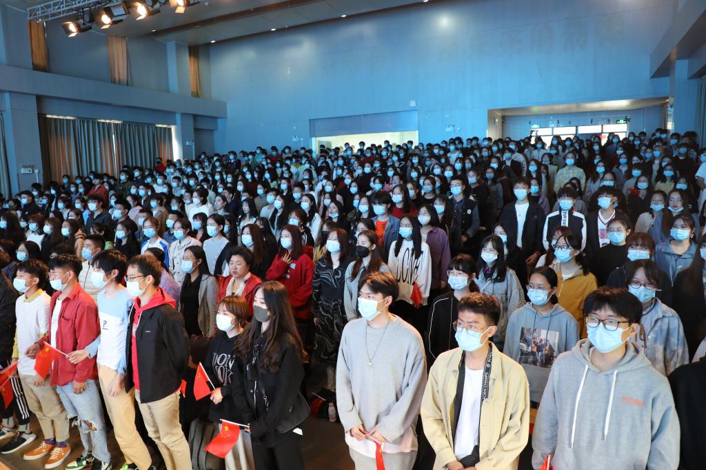 全体新生挥动国旗,齐唱《歌唱祖国》