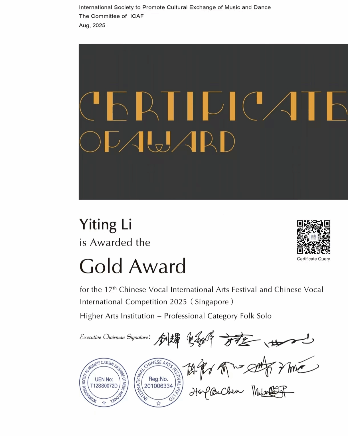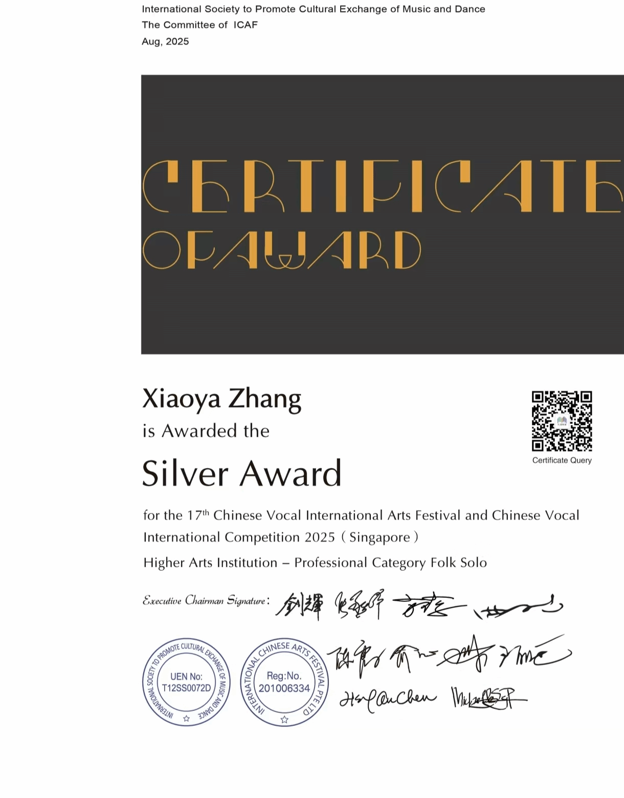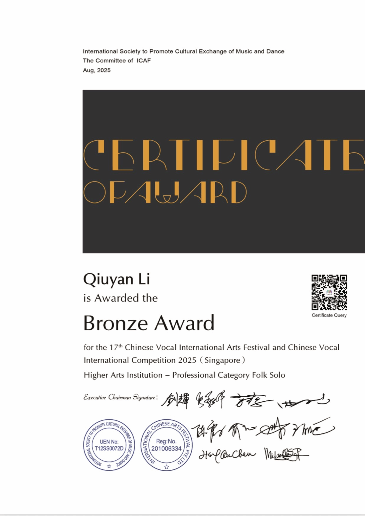 2025年8月7日-8月11日,由国际音乐舞蹈交流促进会主办的第十七届中国声乐国际艺术节暨中国声乐大赛在新加坡举办,中国声乐国际大赛以国际化、专业化著称,汇聚全球声乐领域的顶尖专家与优秀选手,被公认为当今华人声乐界最具权威和影响力的赛事之一。kaiyun开云官方声乐系师生共有7人获奖,其中金奖2人,银奖4人,铜奖1人。其中,声乐系教师付饶获专业组美声独唱项目金奖,2025届民族声乐班毕业生李秋妍获专业组民族声乐独唱项目铜奖(指导教师:林林),2023级民族声乐班张晓丫获专业组民族声乐独唱项目银奖(指导教师:林林),2024级民族声乐班荆艺歆获专业组民族声乐独唱项目银奖(指导教师:林林),2025届民族声乐班毕业生李以婷获专业组民族声乐独唱项目金奖(指导教师:陈红玲),2022级民族声乐班滕姿萱获专业组民族声乐独唱项目银奖(指导教师:陈红玲),2023级民族声乐班贾辰煜获专业组民族声乐独唱项目银奖(指导教师:陈红玲)。