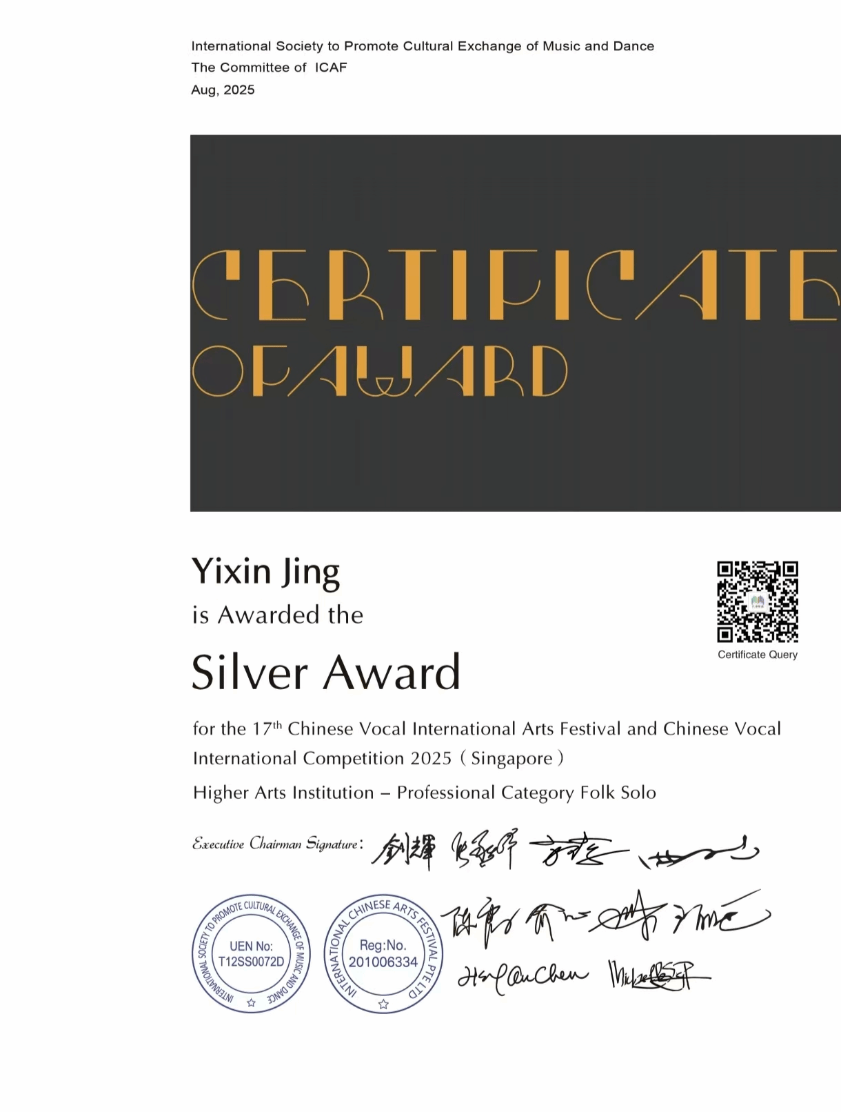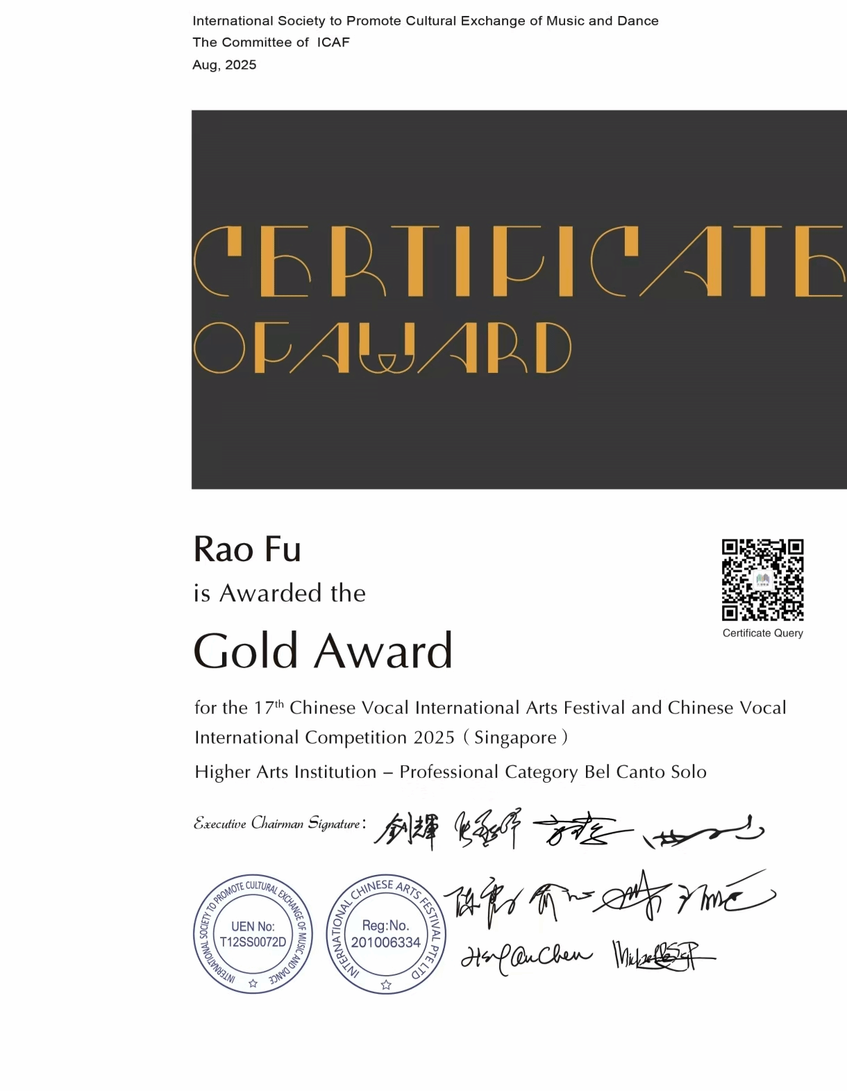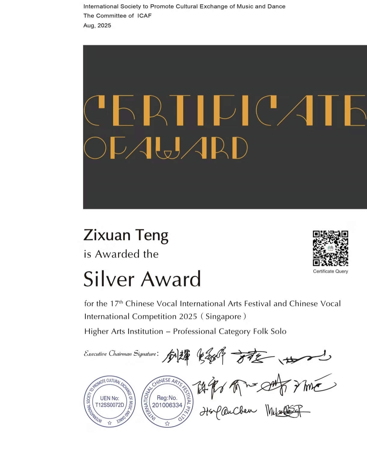 2025年8月7日-8月11日,由国际音乐舞蹈交流促进会主办的第十七届中国声乐国际艺术节暨中国声乐大赛在新加坡举办,中国声乐国际大赛以国际化、专业化著称,汇聚全球声乐领域的顶尖专家与优秀选手,被公认为当今华人声乐界最具权威和影响力的赛事之一。kaiyun开云官方声乐系师生共有7人获奖,其中金奖2人,银奖4人,铜奖1人。其中,声乐系教师付饶获专业组美声独唱项目金奖,2025届民族声乐班毕业生李秋妍获专业组民族声乐独唱项目铜奖(指导教师:林林),2023级民族声乐班张晓丫获专业组民族声乐独唱项目银奖(指导教师:林林),2024级民族声乐班荆艺歆获专业组民族声乐独唱项目银奖(指导教师:林林),2025届民族声乐班毕业生李以婷获专业组民族声乐独唱项目金奖(指导教师:陈红玲),2022级民族声乐班滕姿萱获专业组民族声乐独唱项目银奖(指导教师:陈红玲),2023级民族声乐班贾辰煜获专业组民族声乐独唱项目银奖(指导教师:陈红玲)。
