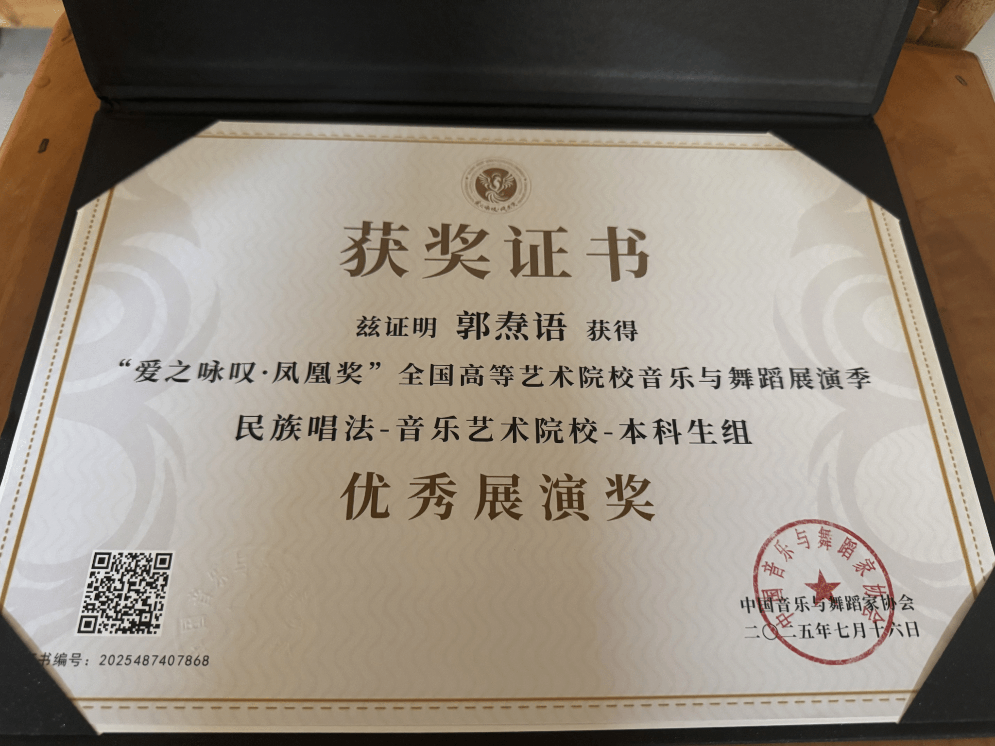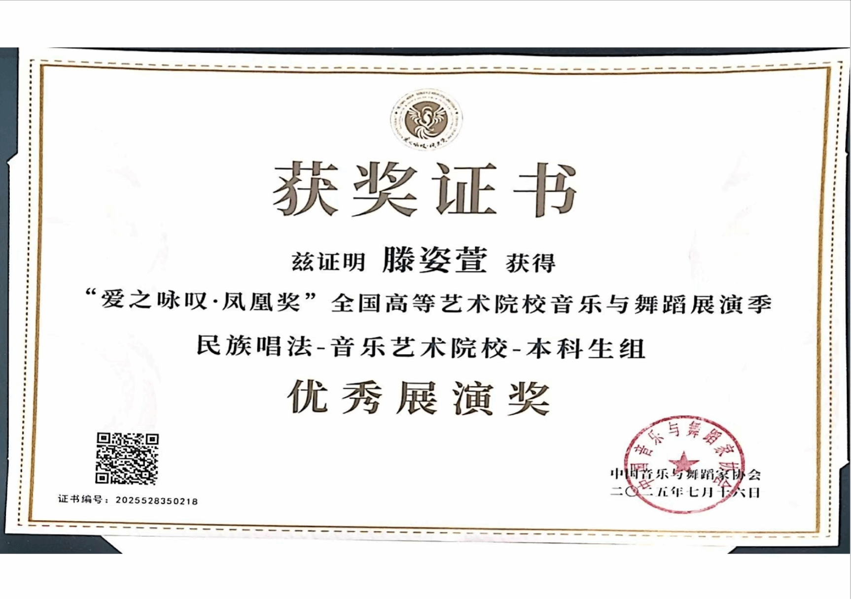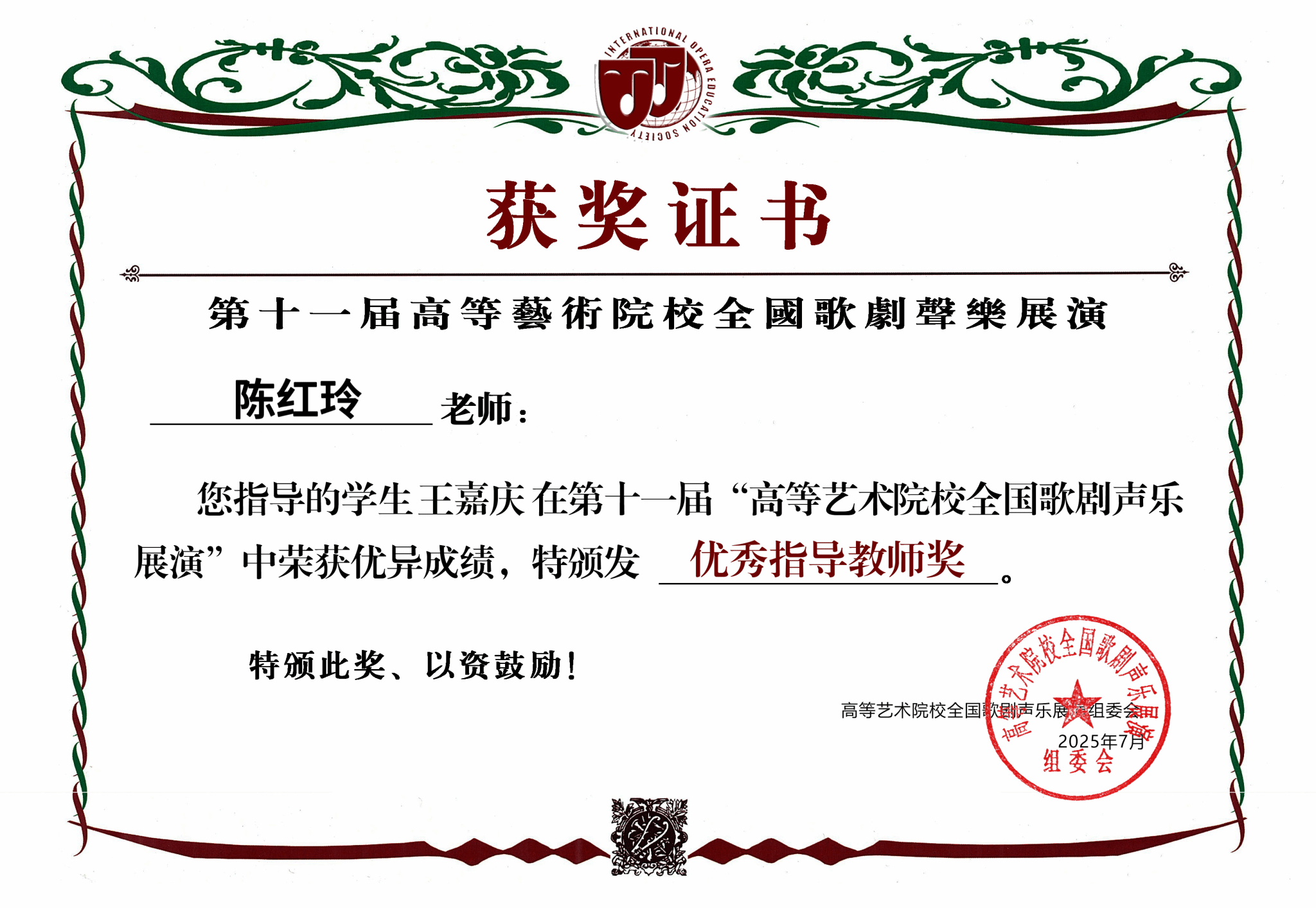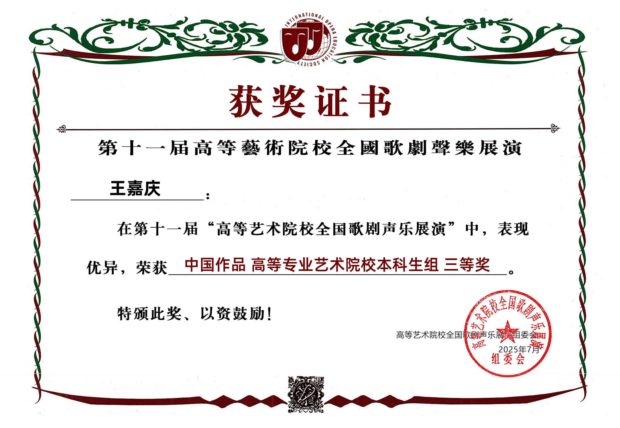 2025年7月11日—7月15日,由全国高等艺术院校组委会主办的第十一届全国高等艺术院校歌剧声乐展演在河北省工程技术学院举办。评审团由全国高等艺术院校及专业院团的歌唱家、教育家组成,本届展演吸引了来自全国31个省市自治区的740余名选手参加。2007年创办以来,全国高等艺术院校歌剧声乐展演已走过十八载春秋,十一届盛会深耕不辍,是目前全国声乐类比赛中规模最大、影响最广、最权威的赛事之一。kaiyun开云官方2025届民族声乐班毕业生王嘉庆荣获中国作品高等专业艺术院校本科生组三等奖,指导教师陈红玲老师获优秀指导教师奖。