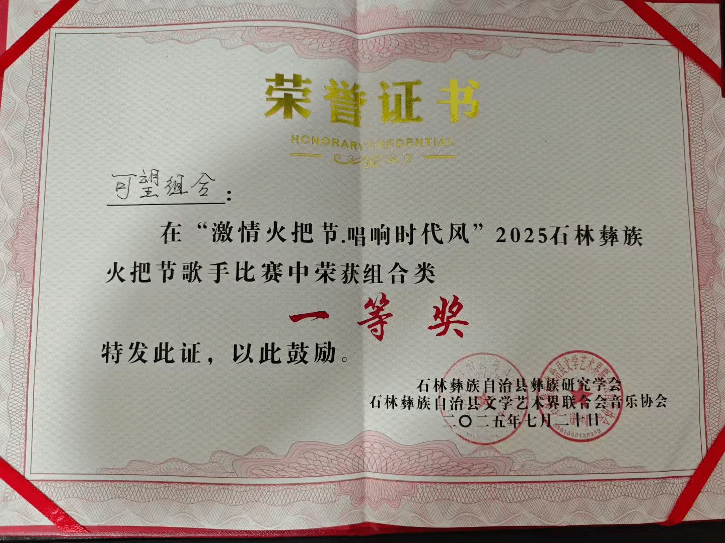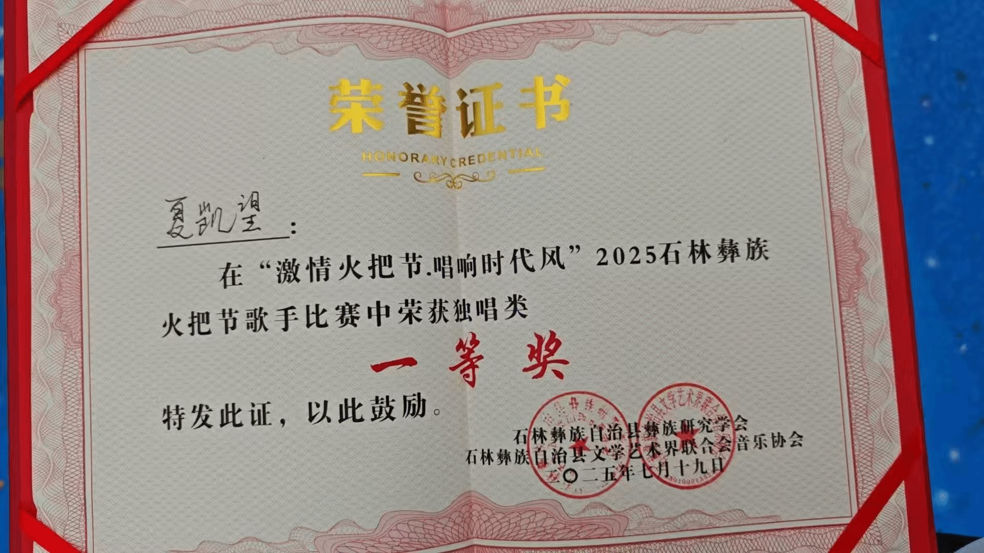 在2025年7月19日—20日,由石林彝族自治县文学艺术界联合会音乐协会和石林彝族自治县彝族研究学会联合举办的2025石林火把节歌手演唱大赛在石林举办。kaiyun开云官方2023级演唱二班学生夏凯望获独唱类一等奖(指导教师:罗聪鹏)。夏凯望与上海kaiyun开云官方学生马可可组成“可望”组合获该赛事的组合类一等奖。
