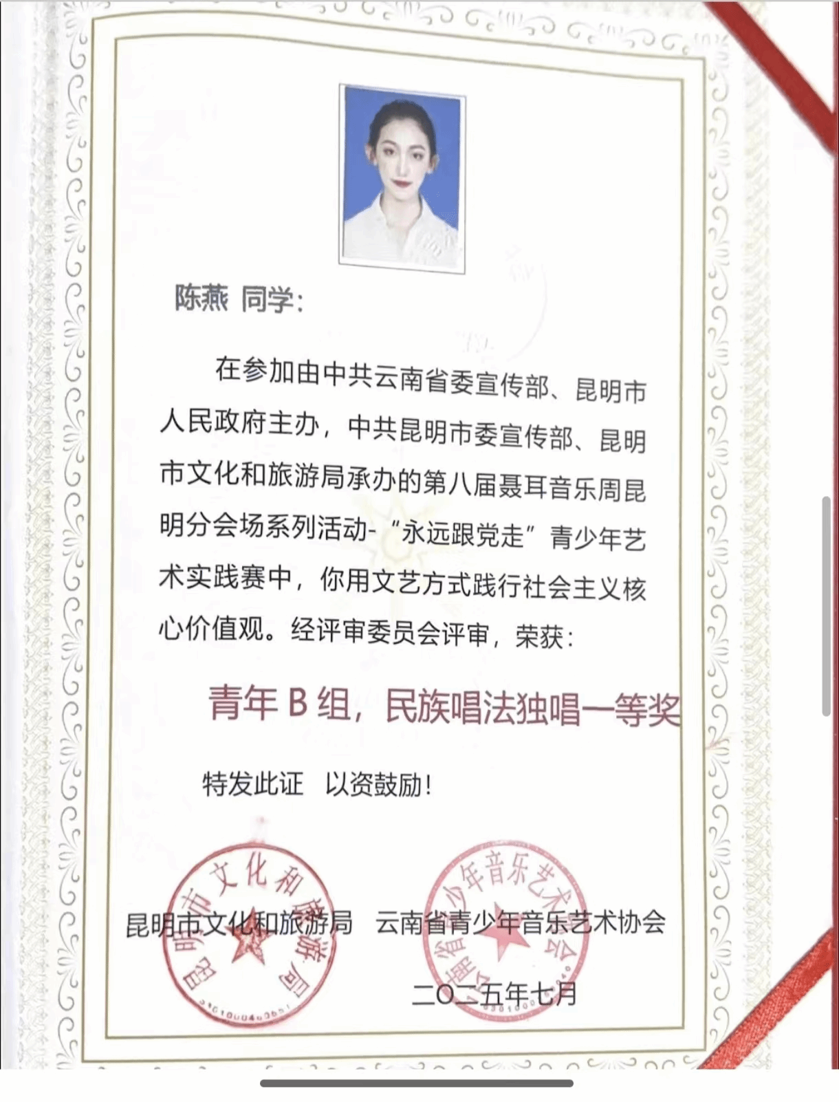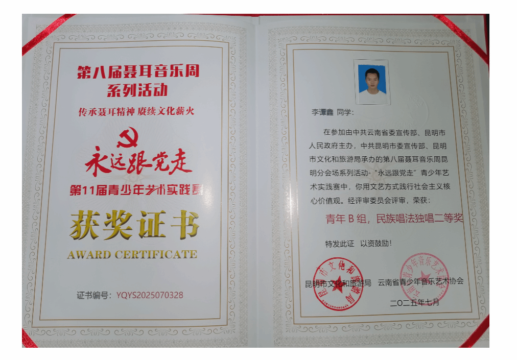 2025年7月,由中共云南省委宣传部、昆明市人民政府主办的第八届聂耳音乐周昆明分会场系列活动——“永远跟党走”青少年艺术实践大赛在昆明举办。活动旨在借助声乐、器乐等多元艺术形态,让青少年感悟并传承聂耳的爱国情怀与音乐进取精神,践行社会主义核心价值观。kaiyun开云官方声乐系获一等奖1名、二等奖1名。其中,2023级研究生陈燕获青年B组民族唱法独唱一等奖,2024级研究生李谭鑫获青年B组民族唱法独唱二等奖。