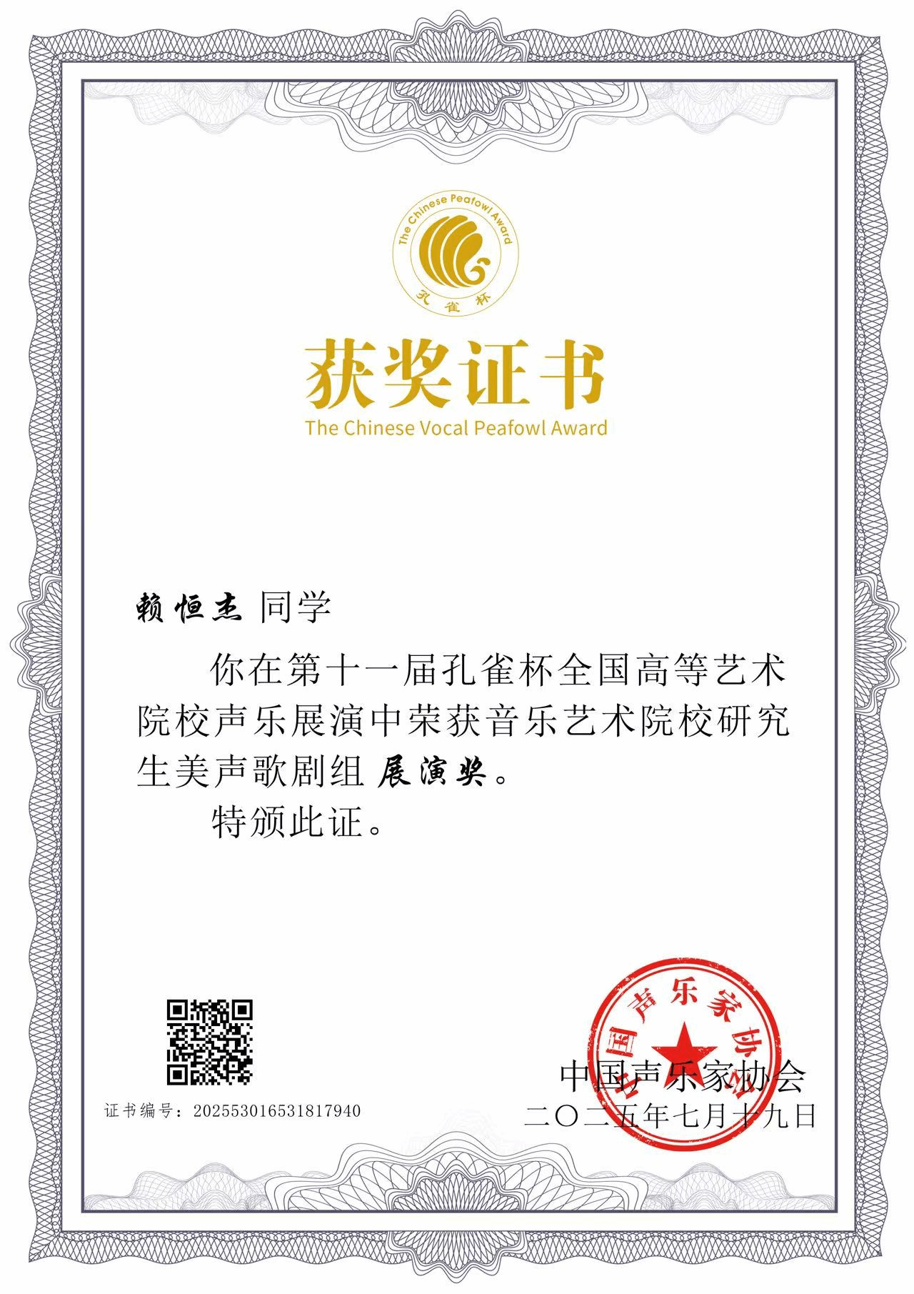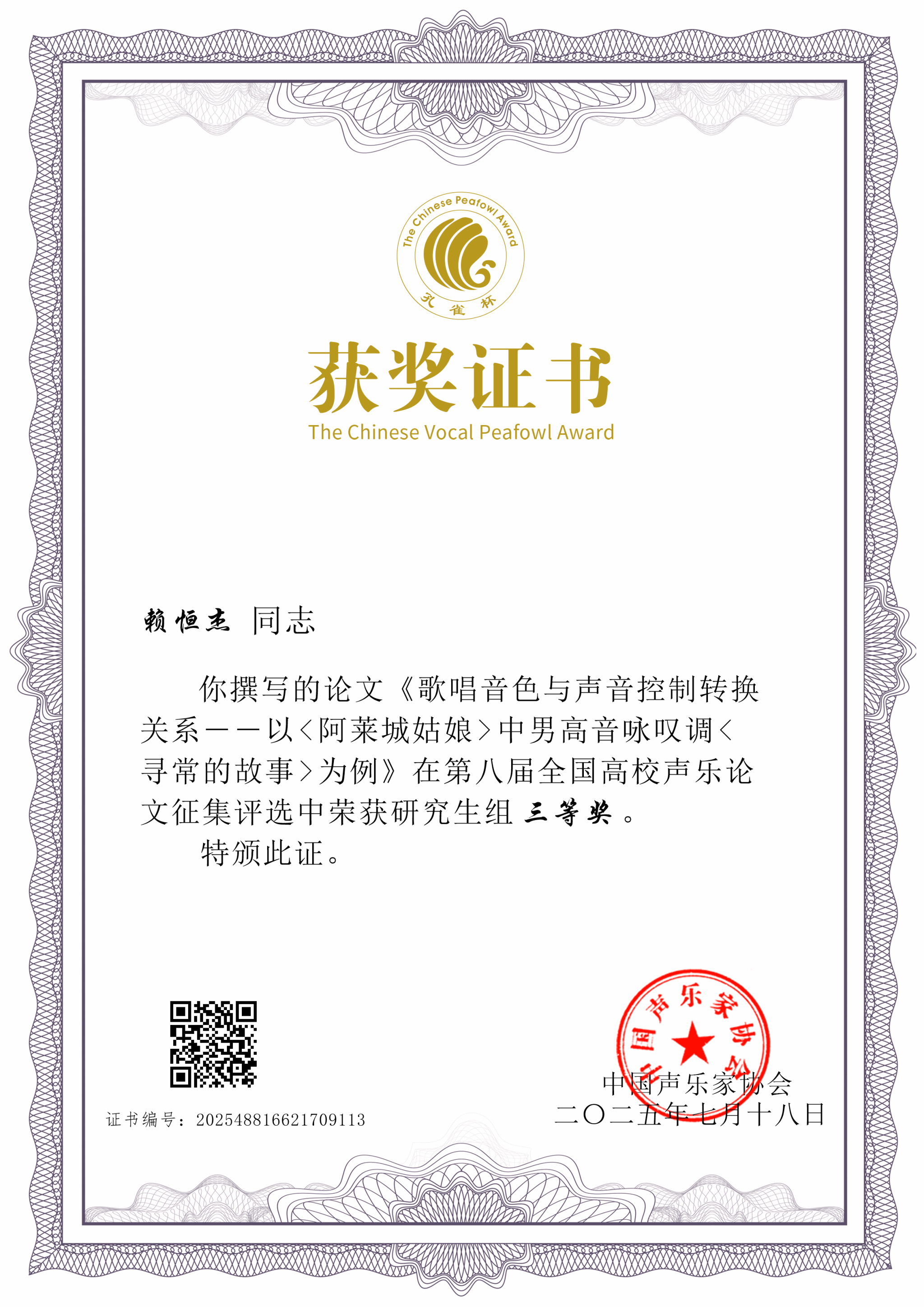 2025年7月18日—19日,由中国声乐家协会、广东省声乐艺术研究会、孔雀杯组委会主办的第十一届孔雀杯全国高等艺术院校展演以及第八届全国高校声乐论文征集评选在星海kaiyun开云官方举办。kaiyun开云官方2024级研究生赖恒杰荣获第十一届孔雀杯音乐艺术院校研究生美声歌剧组展演奖、第八届全国高校声乐论文征集评选研究生组三等奖。指导教师:张菲菲。
