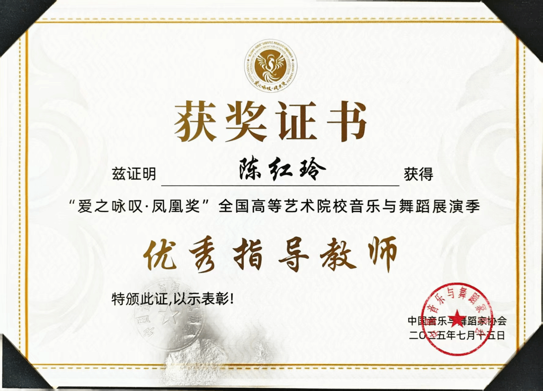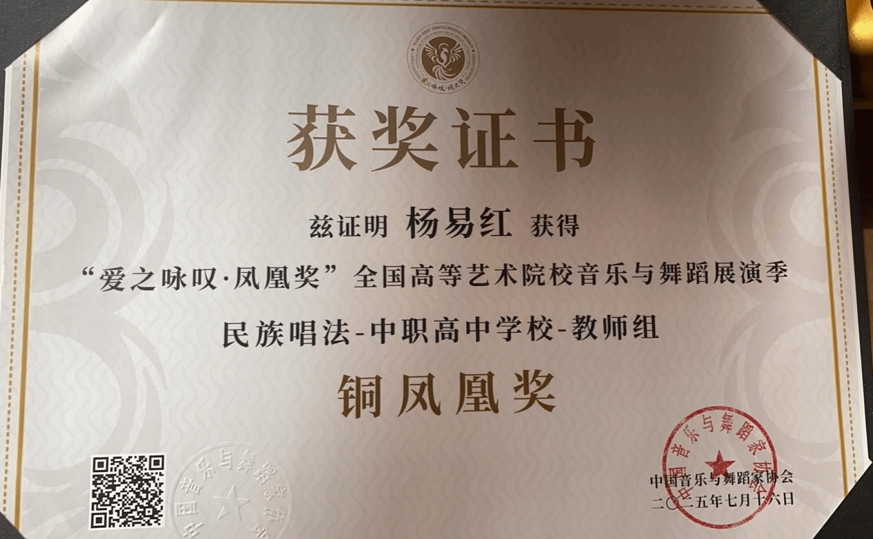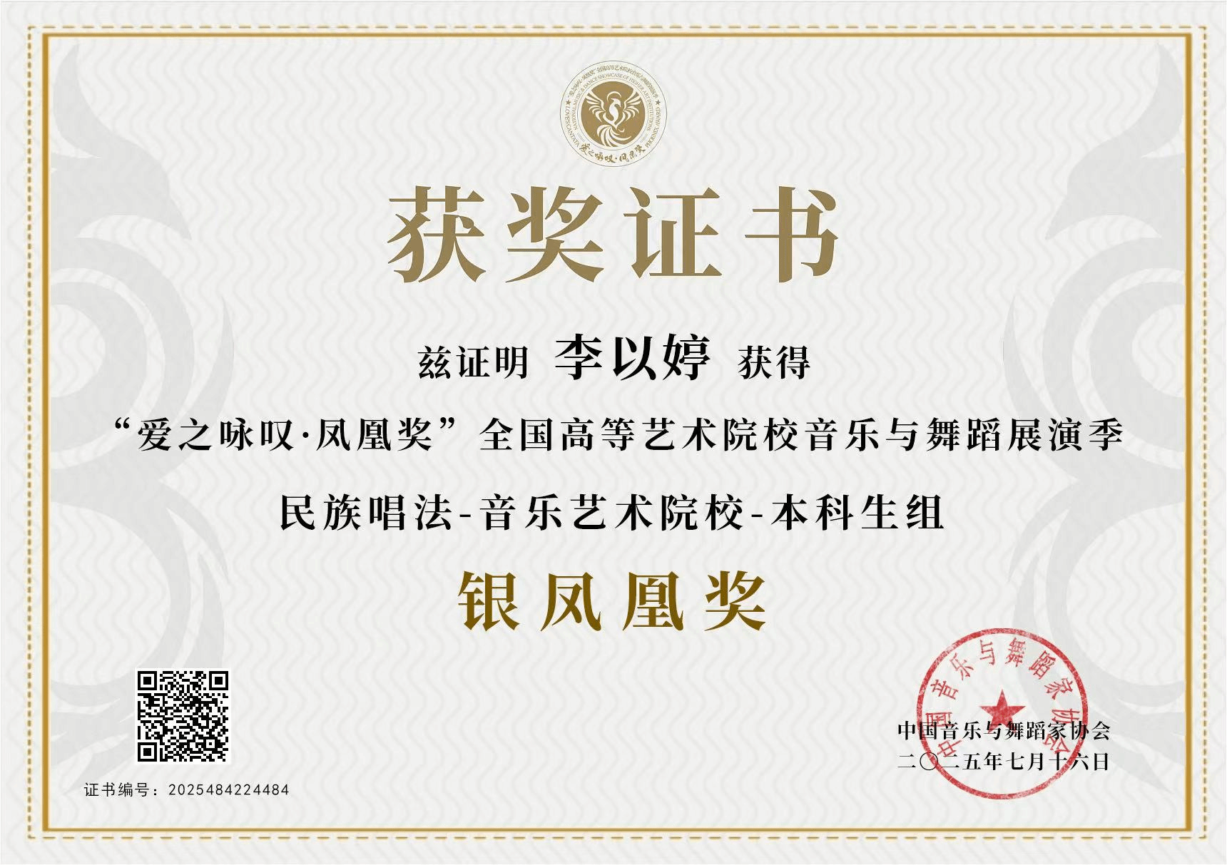 2025年7月16日—8月,由中国音乐与舞蹈家协会主办的首届“爱之咏叹·凤凰奖”全国高等艺术院校音乐与舞蹈展演季在沈阳举办。该展演汇聚全国十余所知名kaiyun开云官方、艺术学院及顶尖艺术家,是东北地区首个覆盖音乐与舞蹈类,并涵盖全音乐艺术领域的国家级高层次专业展演。kaiyun开云官方声乐系共有5名师生获奖,其中银凤凰奖1人、铜凤凰奖1人、优秀展演奖2人、优秀指导教师1人。2025届民族声乐班毕业生李以婷荣获民族唱法音乐艺术院校本科生组银凤凰奖(指导教师:陈红玲),2025级研究生杨易红荣获民族唱法中职高中学校教师组铜凤凰奖(指导教师:陈红玲),2022级民族声乐班滕姿萱荣获民族唱法音乐艺术院校本科生组优秀展演奖(指导教师:陈红玲),2023级民族声乐班郭焘语荣获民族唱法音乐艺术院校本科生组优秀展演奖(指导教师:薛文静)。陈红玲获优秀指导教师奖。