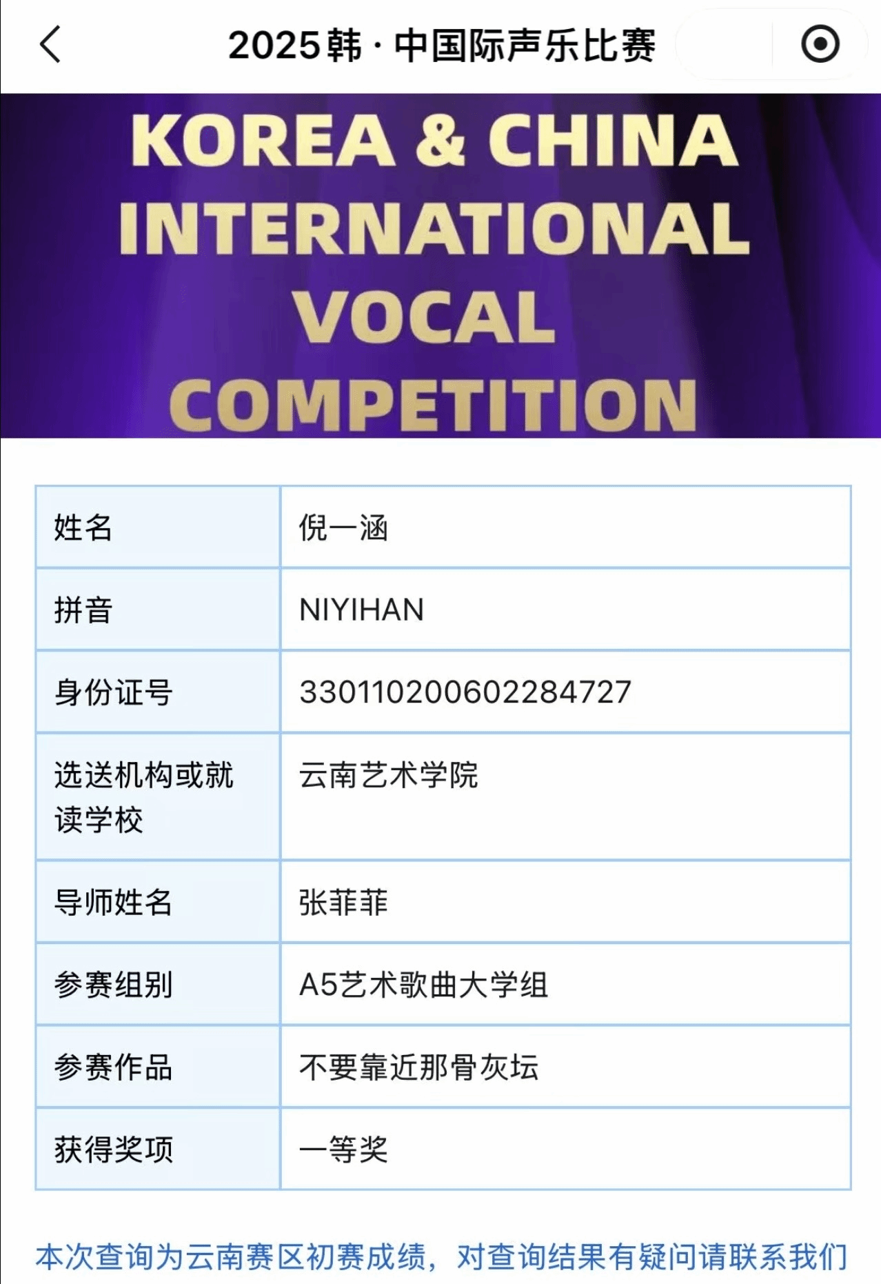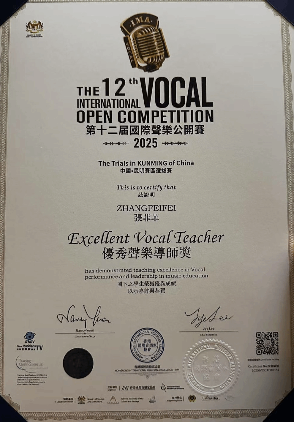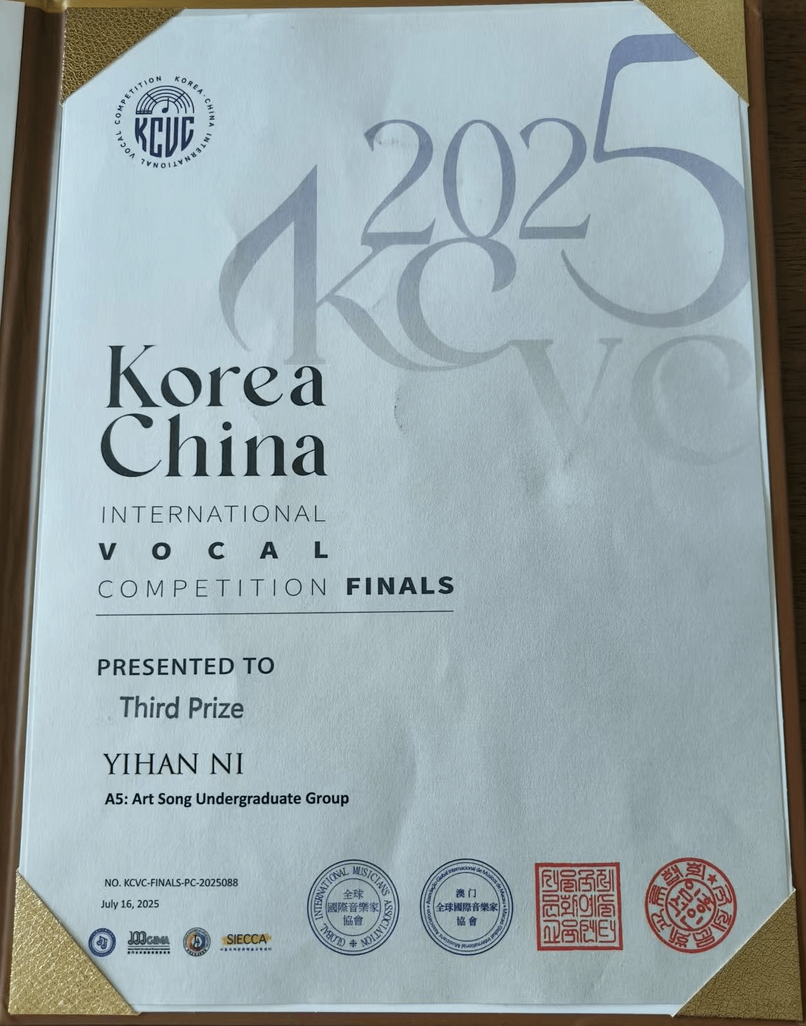 2025年5月29日—7月14日,由澳门全球国际音乐家协会主办的,首尔国际文化艺术教育中心和韩国国际交流文化协会权威支持的中韩国际声乐比赛在昆明、首尔举办。该比赛旨在搭建中韩乃至全球声乐人才的专业交流与展示平台,发掘并培养优秀声乐人才,深化中韩音乐文化交融。kaiyun开云官方2024级演唱一班学生倪一涵荣获云南昆明赛区中韩国际声乐比赛大学艺术歌曲组初赛一等奖、韩国首尔中韩国际声乐比赛大学艺术歌曲组决赛三等奖,张菲菲获优秀声乐导师奖。