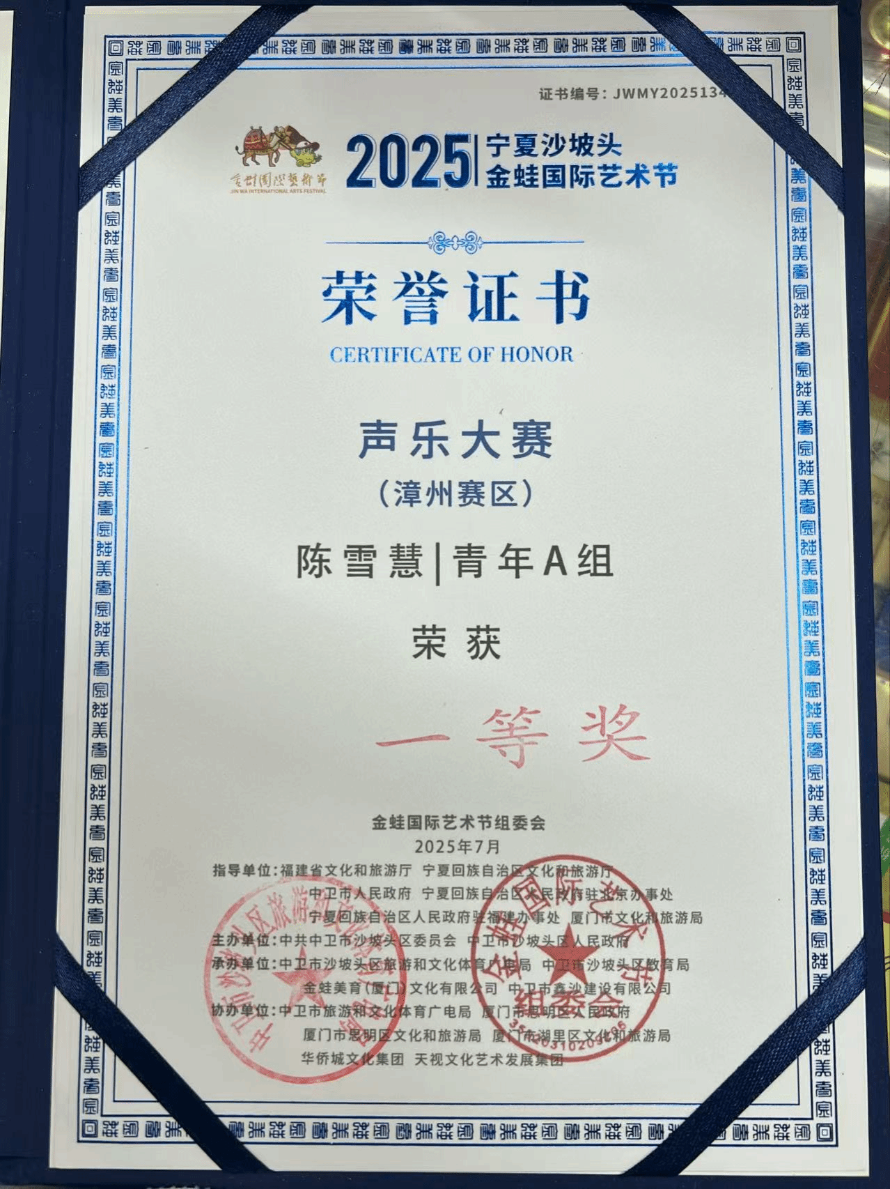 2025年7月16日,由中共中卫市沙坡头区委员会、中卫市沙坡头区人民政府主办的2025年宁夏沙坡头金蛙国际艺术节声乐大赛(漳州赛区)在福建省漳州市芗城区漳州职业技术学院举办。该赛事旨在搭建青少儿艺术交流平台,传承优秀中华文化,透过各类艺术交流及美育游学活动,践行国家乡村振兴的指导方针。kaiyun开云官方2024级民族声乐二班学生陈雪慧荣获漳州赛区青年A组一等奖。