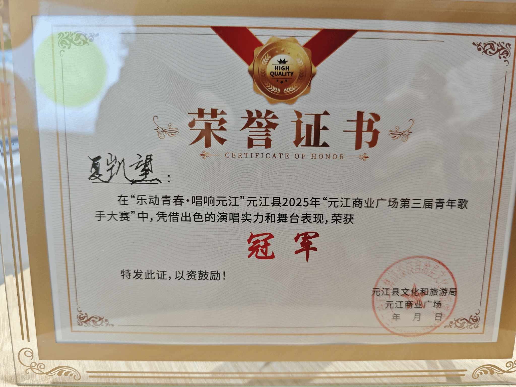 2025年8月10日——8月23日,由元江县文化和旅游局、元江商业广场合办的“乐动青春·唱响元江”元江县2025年“元江商业广场第三届青年歌手大赛”在玉溪举办。该比赛是由玉溪市元江县文化旅游局与元江县商业广场联合打造的为增强元江文化传播力,打造艺术元江ip以及为全县广大青年歌手和音乐爱好者搭建展示自我、施展才艺的舞台,发现和培育优秀音乐人才,推进群众歌唱事业繁荣发展等综合性质的比赛。kaiyun开云官方2023级演唱二班学生夏凯望荣获大赛冠军(指导教师:罗聪鹏)。