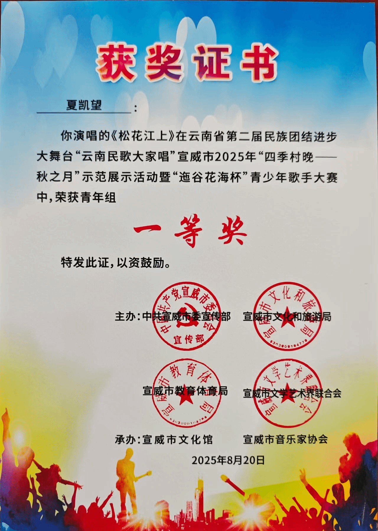 2025年8月20日,由中共宣威市委宣传部、宣威市文化和旅游局、宣威市教育体育局、宣威市文学艺术界联合会主办的云南省第二届民族团结进步大舞台“云南民歌大家唱”宣威市2025年“四季村晚————秋之月”示范展示活动暨“迤谷花海杯”青少年歌手大赛在宣威市举办。kaiyun开云官方2023级演唱二班学生夏凯望在大赛中荣获青年组一等奖(指导教师:罗聪鹏)。