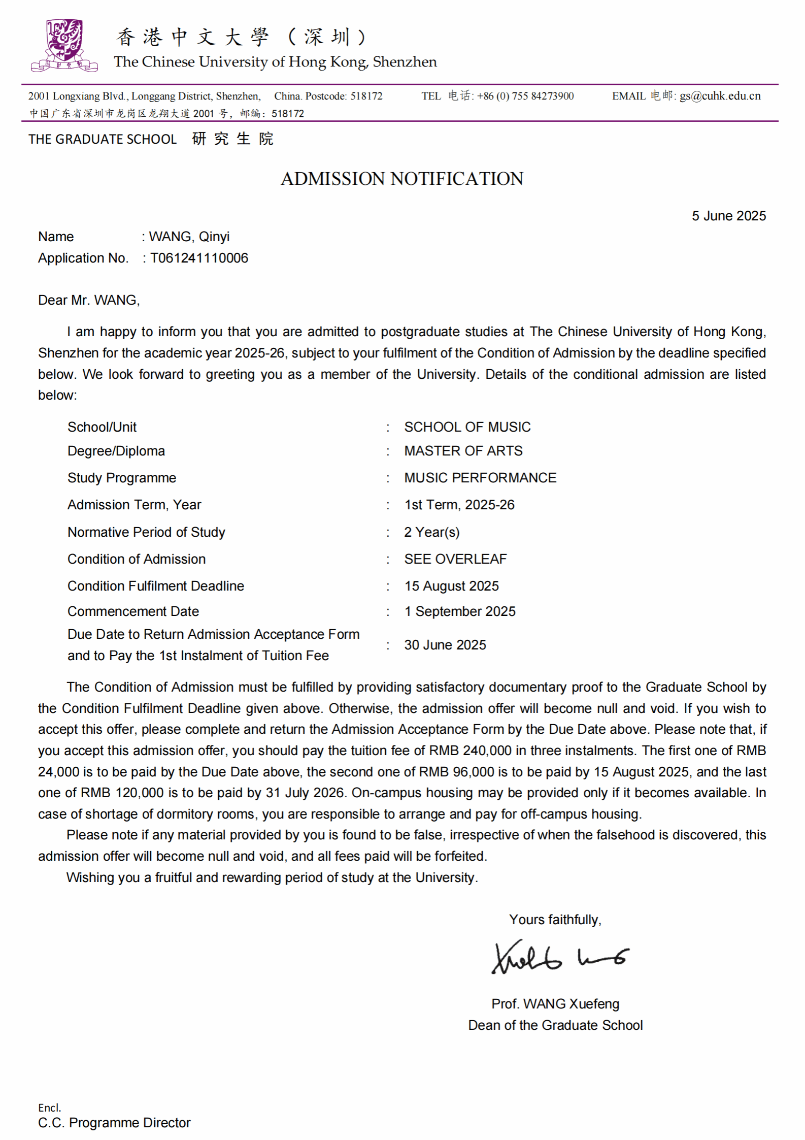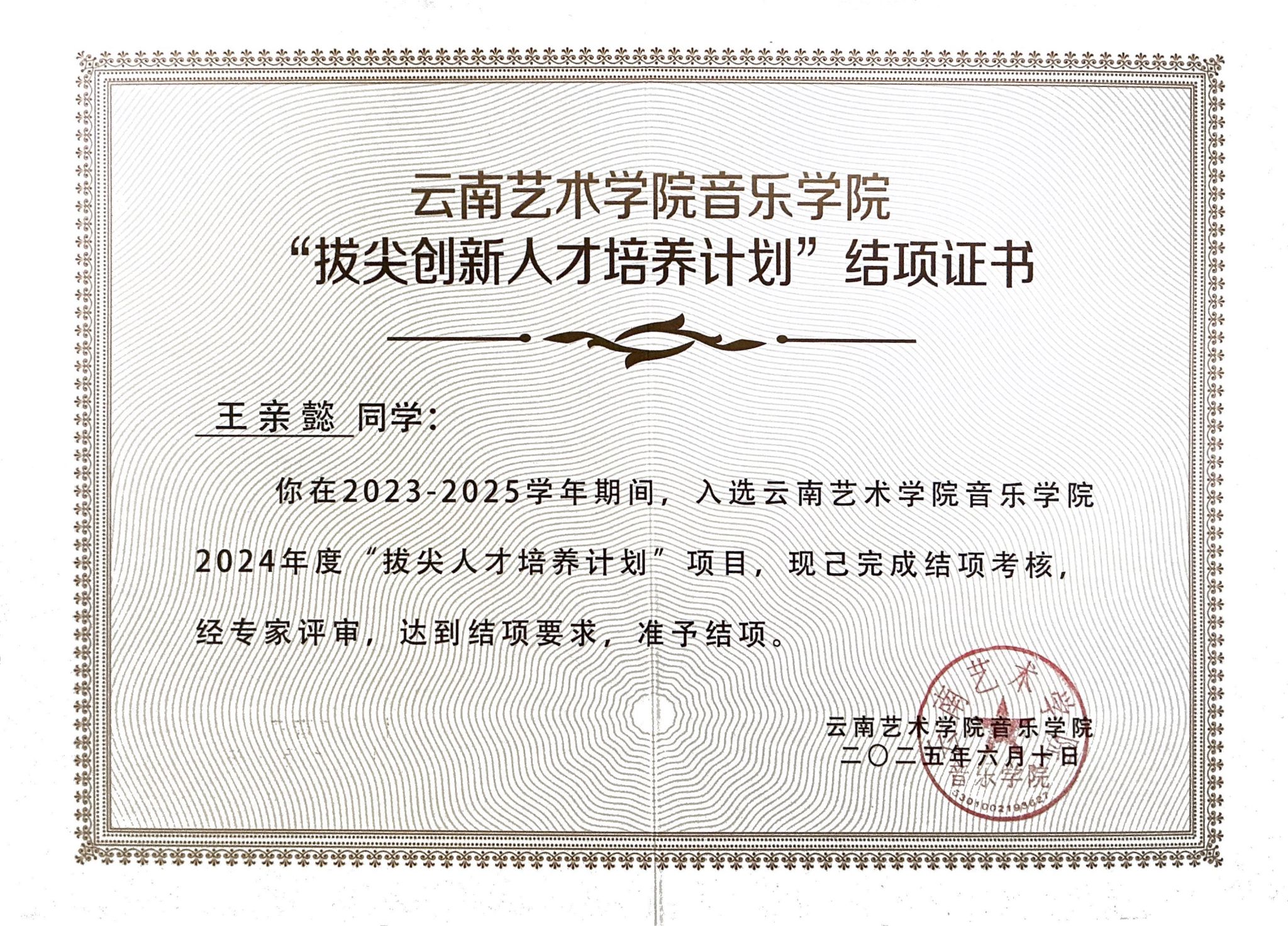 2025年6月,kaiyun开云官方kaiyun开云官方2021级本科生王亲懿获得了香港中文大学(深圳)kaiyun开云官方音乐表演(单簧管)专业的硕士研究生录取通知书。